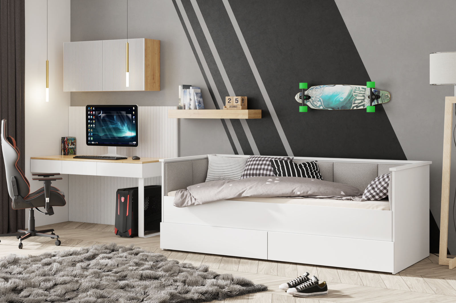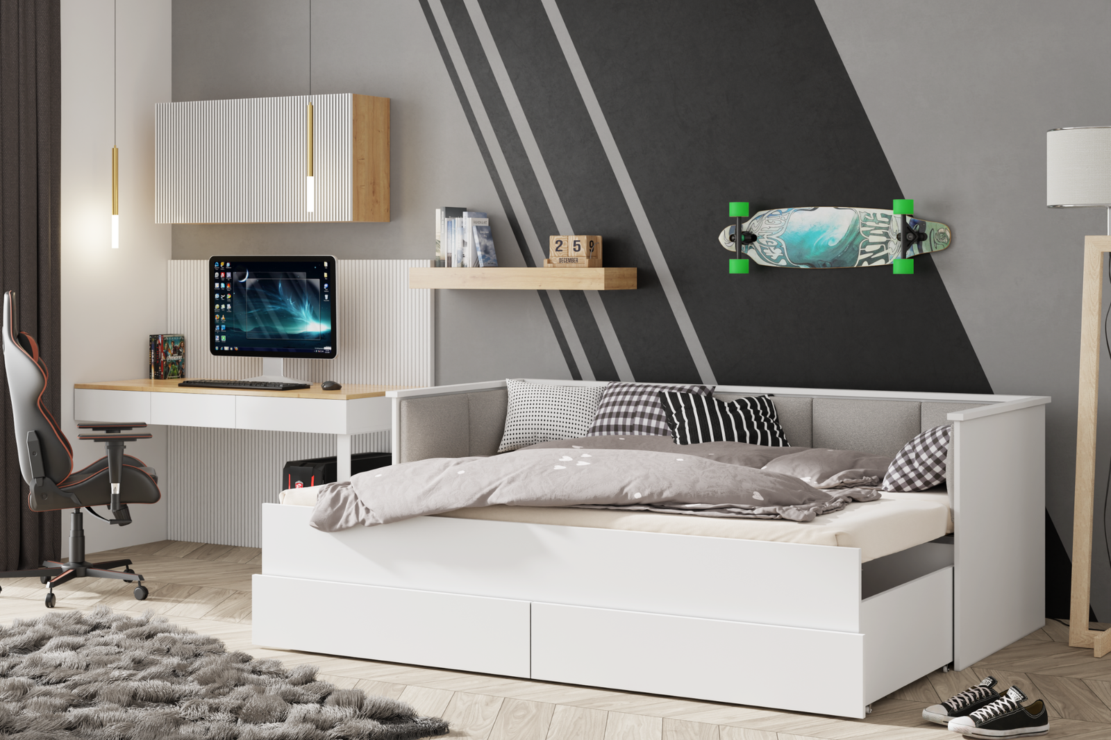 Łóżko HELIOS to doskonały wybór dla nastolatków, którzy potrzebują wygodnego miejsca do snu, odpoczynku i spotkań ze znajomymi. Funkcja rozkładania oraz panele tapicerowane czynią je meblem wielozadaniowym, idealnym zarówno do małych, jak i przestronnych pokoi.