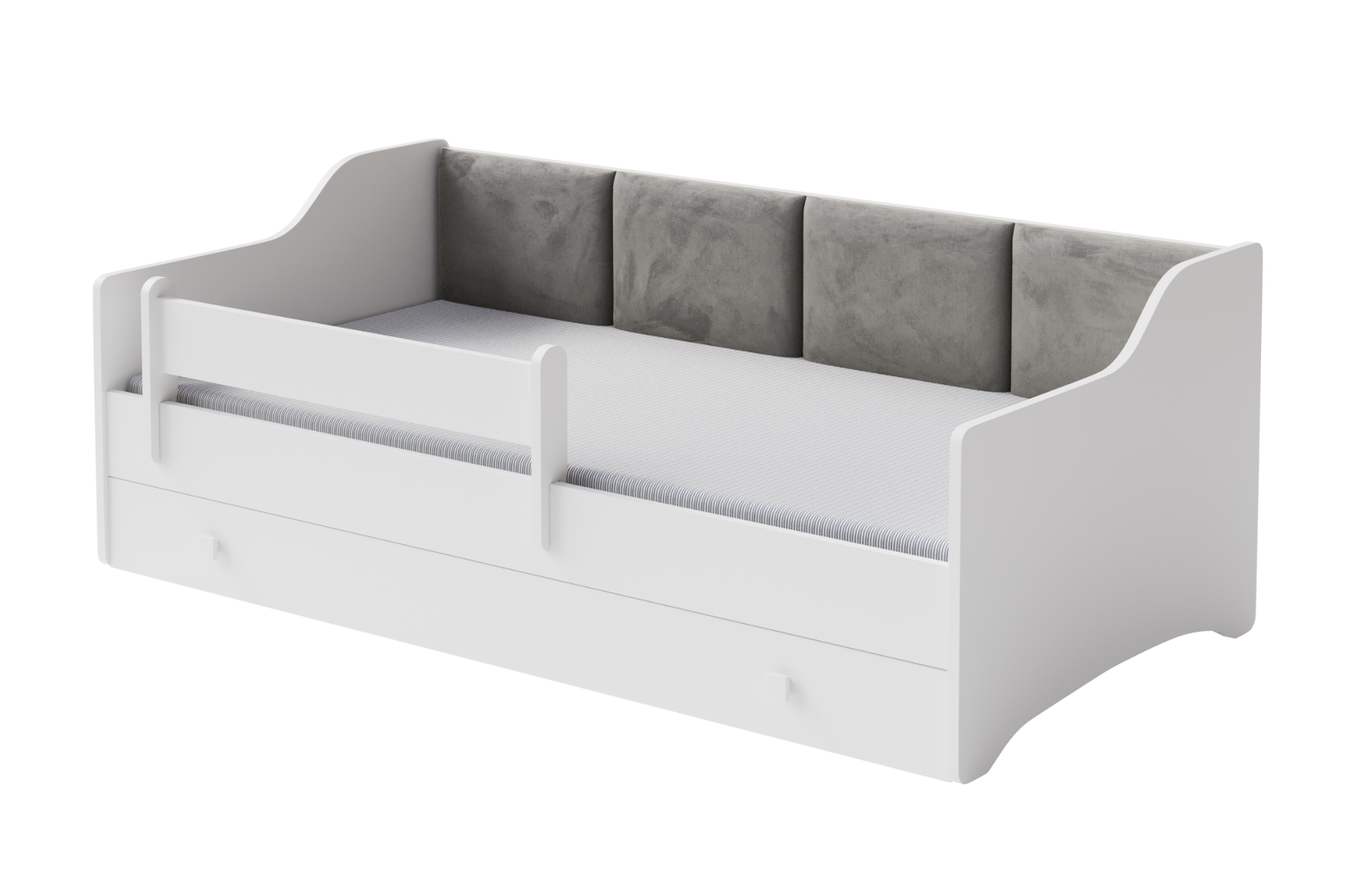 Łóżko dziecięce ERYK to połączenie komfortu, bezpieczeństwa i funkcjonalności w jednym meblu. Jego interesujący, a zarazem minimalistyczny design sprawia, że z łatwością dopasowuje się do różnych stylów wnętrz, a przy tym doskonale sprawdzi się zarówno w pokoju chłopca, jak i dziewczynki. Wybierając model ERYK, warto zwrócić uwagę na jego praktyczne rozwiązania. Jednym z atutów jest podwyższona konstrukcja tyłu i boków łóżka, dzięki czemu w ciągu dnia może ono pełnić funkcję wygodnej sofy, idealnej do siedzenia i odpoczynku. Dla jeszcze większego komfortu, w zestawie znajdują się cztery panele tapicerowane przyjemną w dotyku tkaniną velvet. Panele zapewniają wygodne oparcie dla pleców podczas siedzenia, ale również stanowią dodatkową miękką ochronę podczas snu.