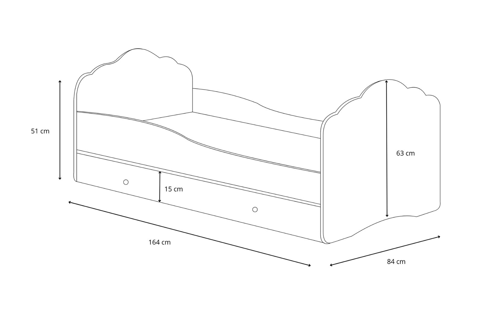 • • Łóżko: 164 cm x 84 cm x 63 cm
