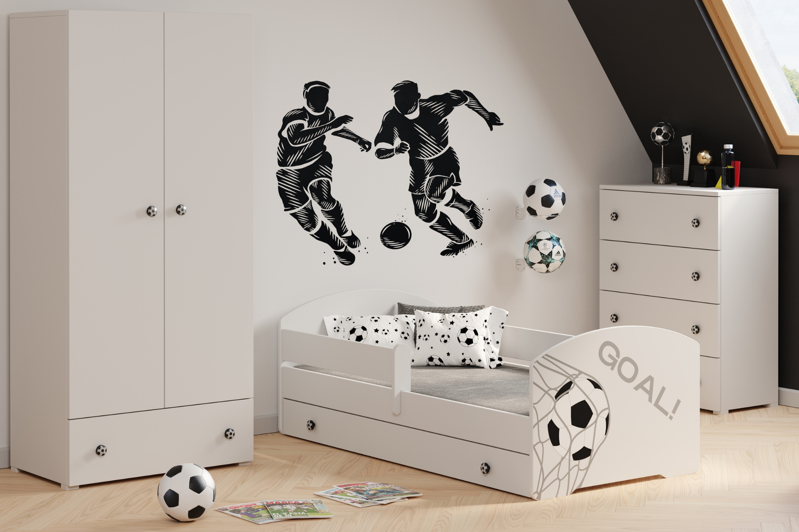 • Łóżko dziecięce z barierką, szufladą i grafiką piłkarską to idealny mebel dla małego fana futbolu!