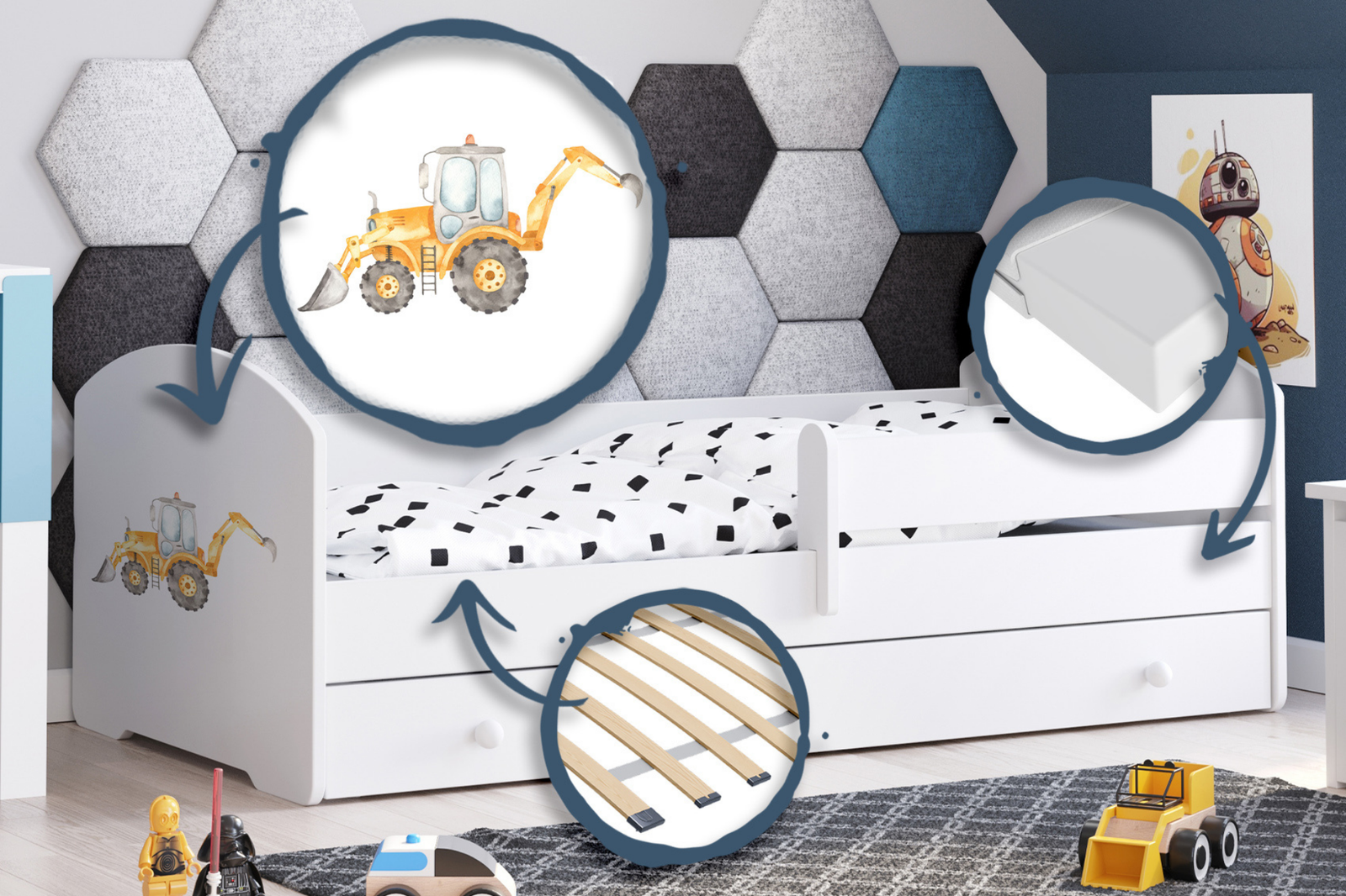 • Łóżko dziecięce z barierką, szufladą i grafiką koparki to idealny wybór dla chłopca!