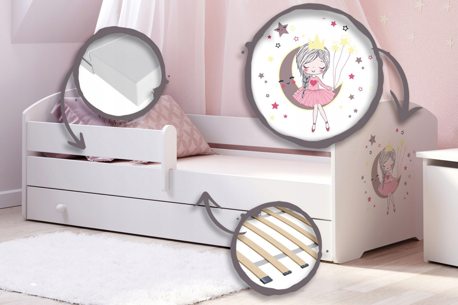 Łóżko pojedyncze LUK 160x80 z barierką i szufladą - Śpiąca księżniczka