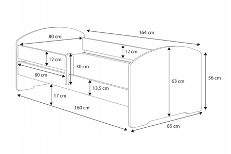 • • Łóżko: 164 cm x 85 cm x 63 cm