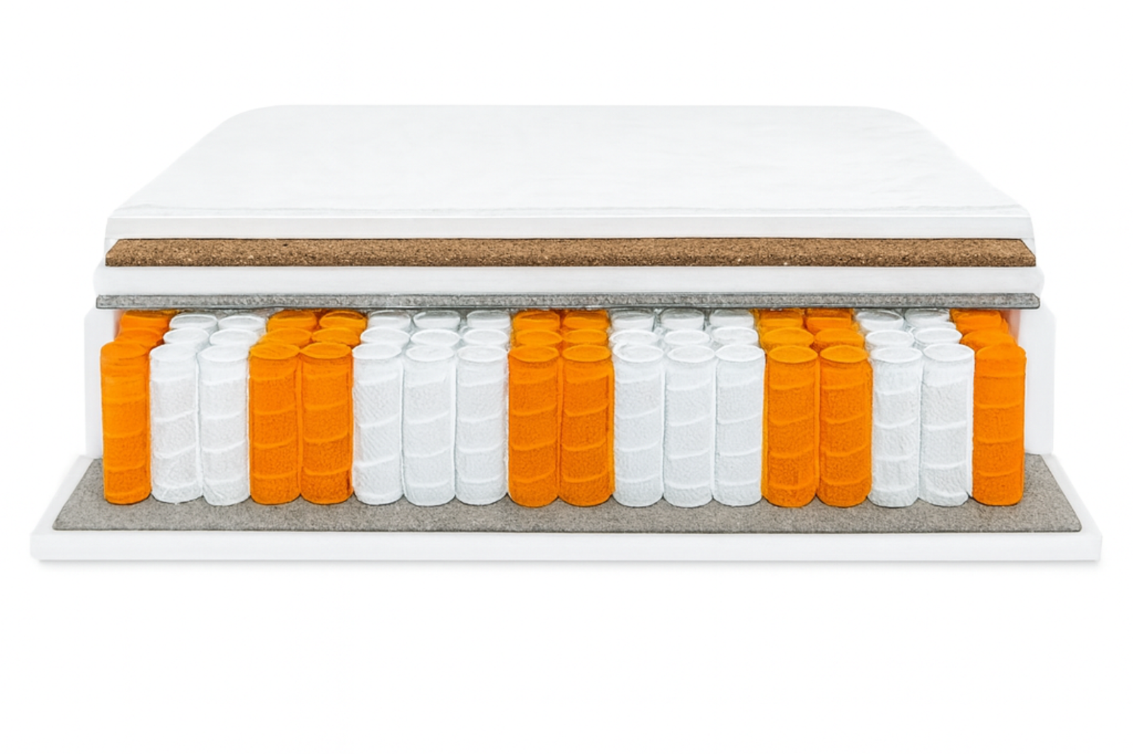 Sercem materaca są niezależne sprężyny kieszeniowe, które działają punktowo, dopasowując się do naturalnych krzywizn ciała. Dzięki gęstości około 260 szt./m² materac reaguje precyzyjnie na nacisk i tłumi ruchy partnera, gwarantując spokojny, niezakłócony sen oraz właściwe ułożenie kręgosłupa.