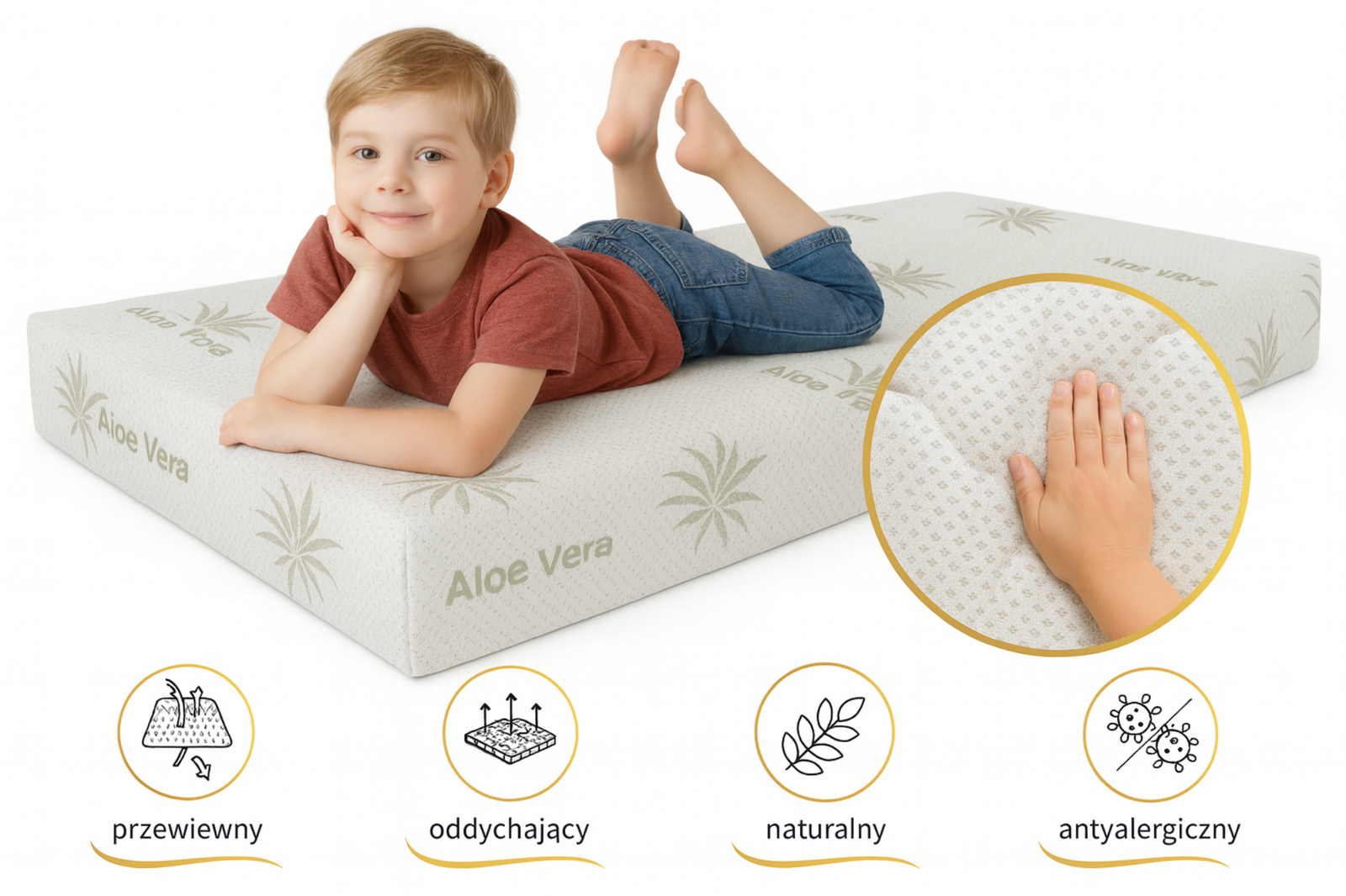 Materac dba o Twój komfort snu, a my dbamy o każdy szczegół jego wykończenia. Pokrowiec z naturalnymi właściwościami ALOE VERA wykończony został specjalną apreturą z aloesem, który działa kojąco, łagodząco na skórę i wspiera higienę snu. Materiał, z którego powstał pokrowiec jest miękki i przyjemny w dotyku, co sprawia, że każde zetknięcie z nim jest czystą przyjemnością. Gramatura 165 g/m² oraz specjalny splot sprawiają, że pokrowiec jest wytrzymały i długo zachowuje swoje właściwości. Struktura tkaniny wspiera prawidłową cyrkulację powietrza. Pokrowiec zapinany jest na zamek błyskawiczny, dzięki czemu jest łatwy w utrzymaniu czystości. Nie wymaga skomplikowanej pielęgnacji, można go więc bezpiecznie użytkować przez długi czas, a dla odświeżenia pokrowiec można prać w temperaturze 30 stopni. Pokrowiec posiada certyfikat OEKO-TEX Standard 100, który potwierdza, że tkanina jest wolna od szkodliwych substancji i bezpieczna dla dzieci i osób z alergiami. Wysokiej jakości tkanina powstała zgodnie z europejskimi standardami jakości i bezpieczeństwa, co potwierdzają testy laboratoryjne.
