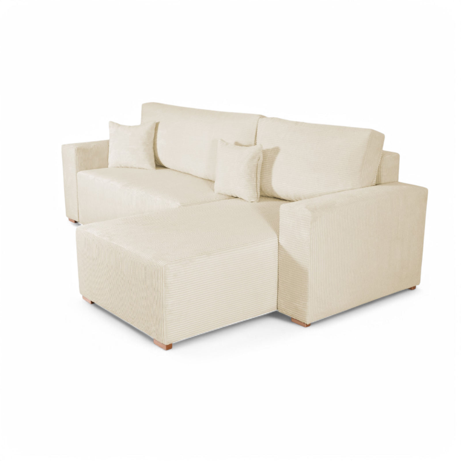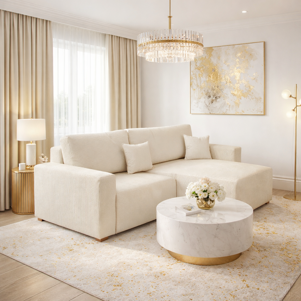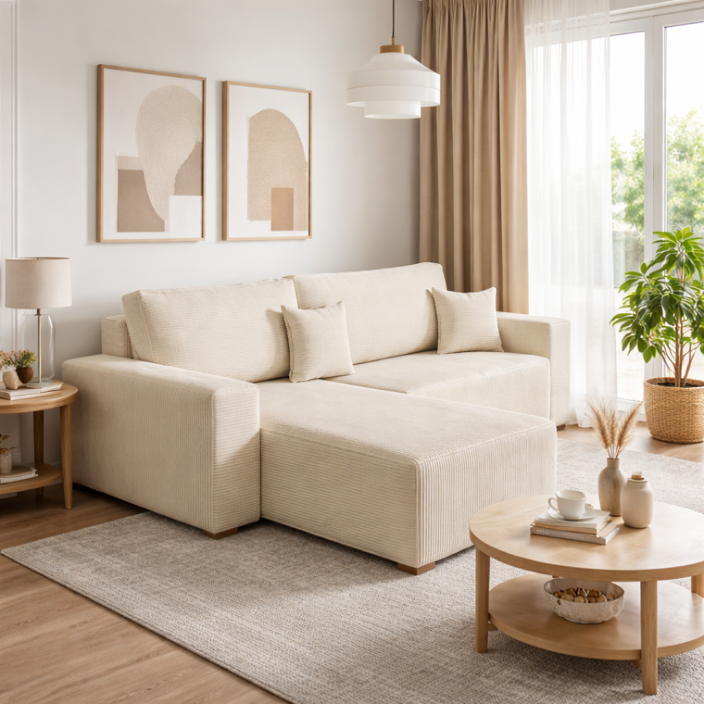 Narożnik ELVAR to idealne połączenie wygody, estetyki i praktycznych rozwiązań. Dzięki kompaktowej formie doskonale sprawdzi się w mniejszych pomieszczeniach, takich jak salon, pokój gościnny czy kawalerka. Klasyczna linia, modna tkanina sztruksowa oraz funkcja spania czynią go meblem dopasowanym do codziennych potrzeb.