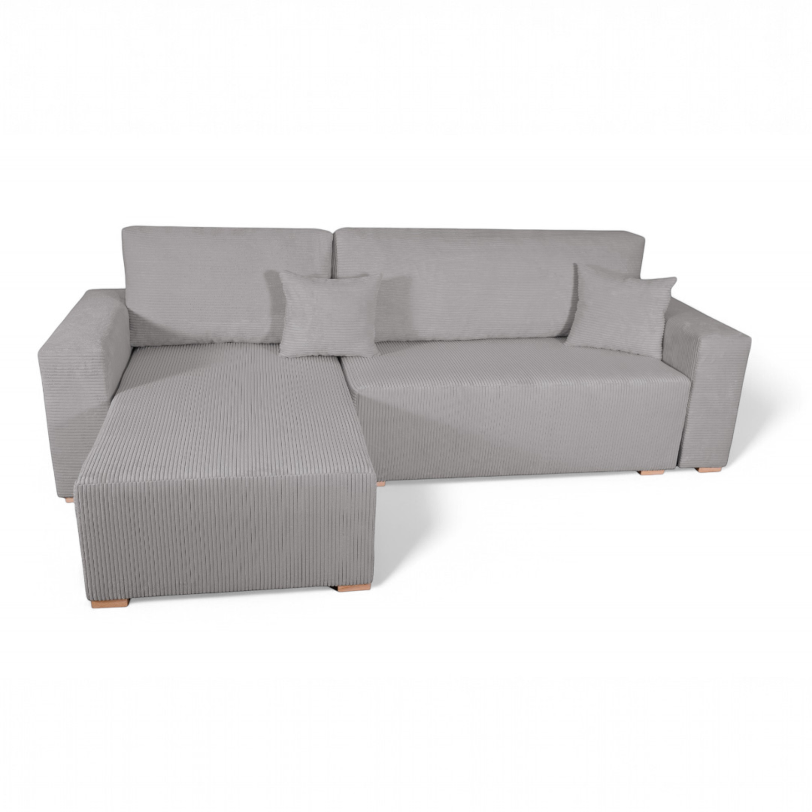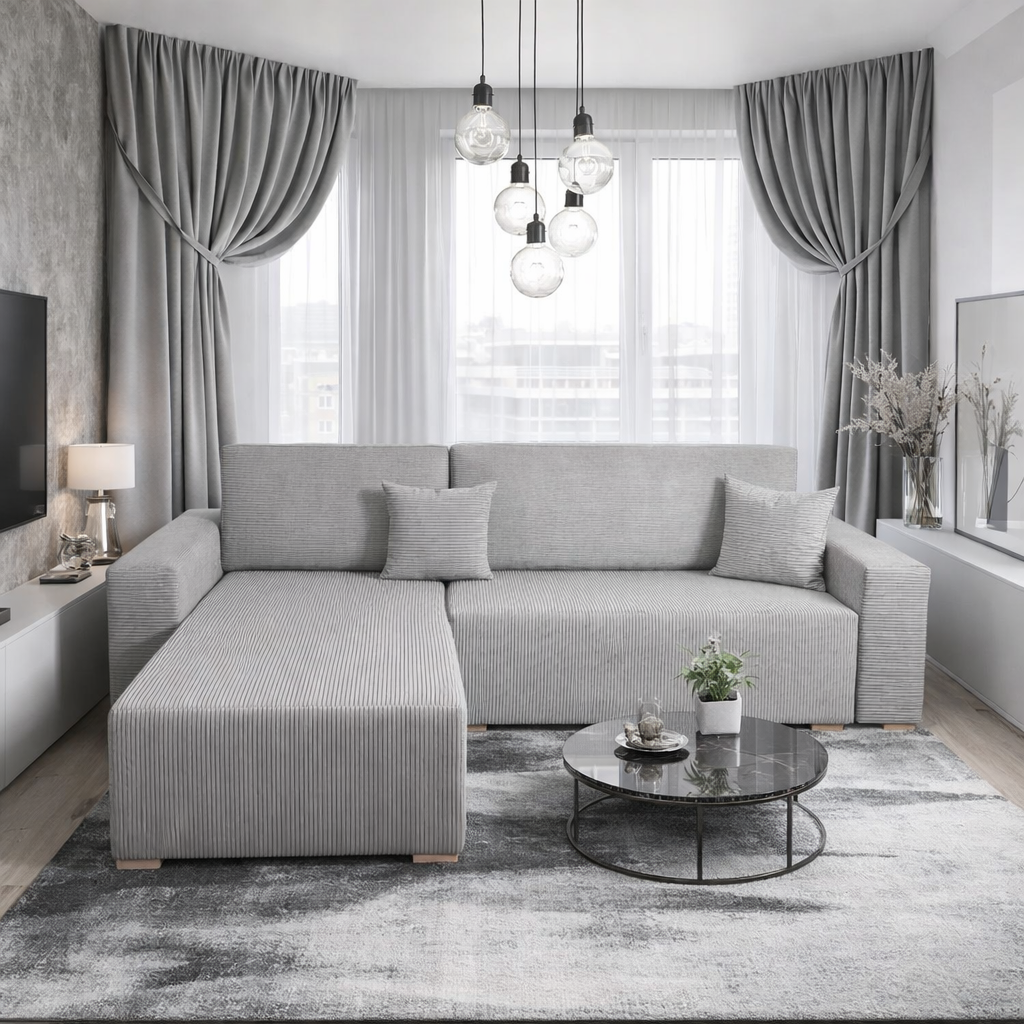 Narożnik ELVAR to połączenie eleganckiego wyglądu z praktycznymi rozwiązaniami, które doskonale sprawdzą się w codziennym użytkowaniu. Wykonany z modnej tkaniny sztruksowej, przyciąga wzrok i nadaje wnętrzu przytulnego charakteru. Kompaktowa forma sprawia, że idealnie pasuje do salonu, pokoju gościnnego czy nowoczesnej kawalerki, nie zajmując przy tym zbyt wiele miejsca.