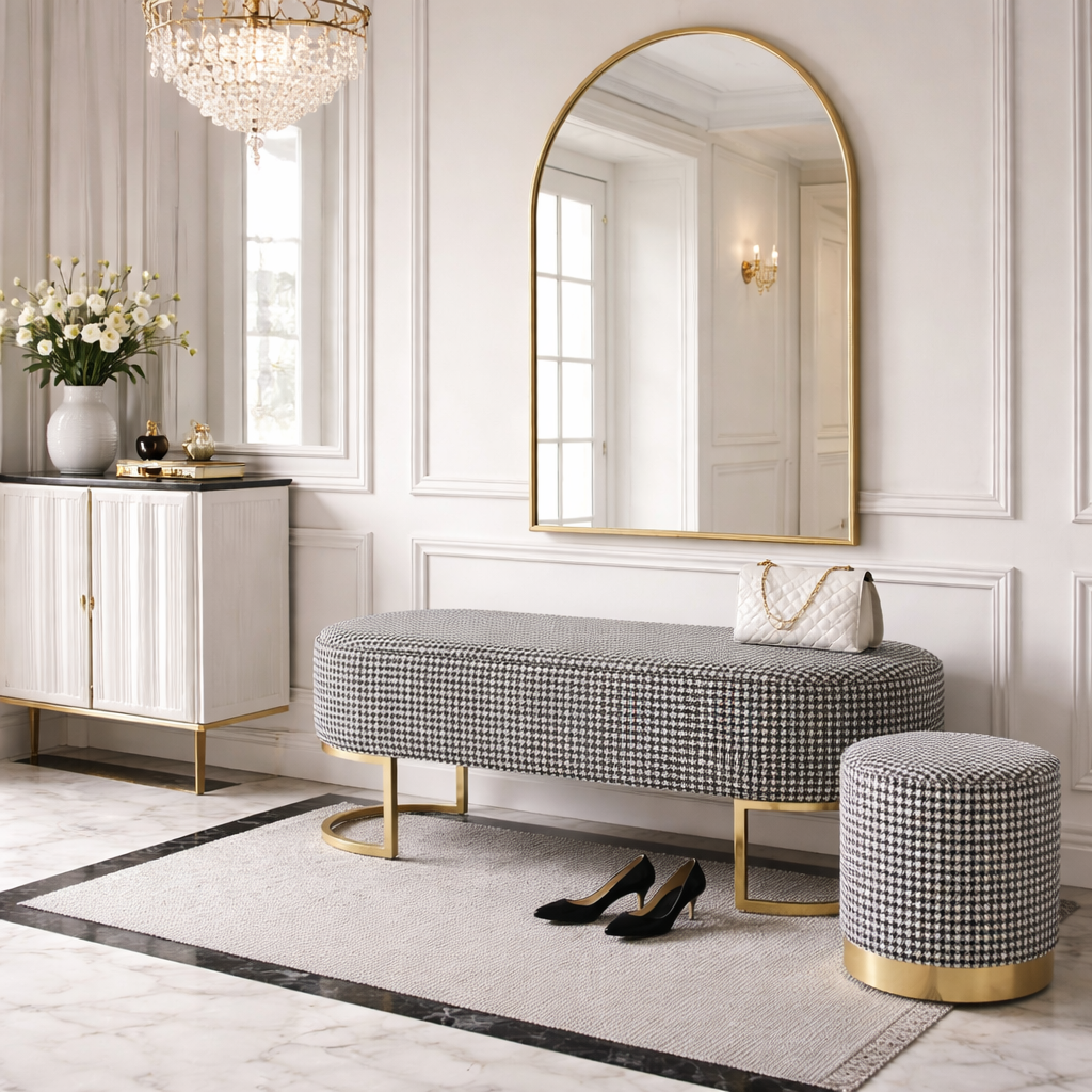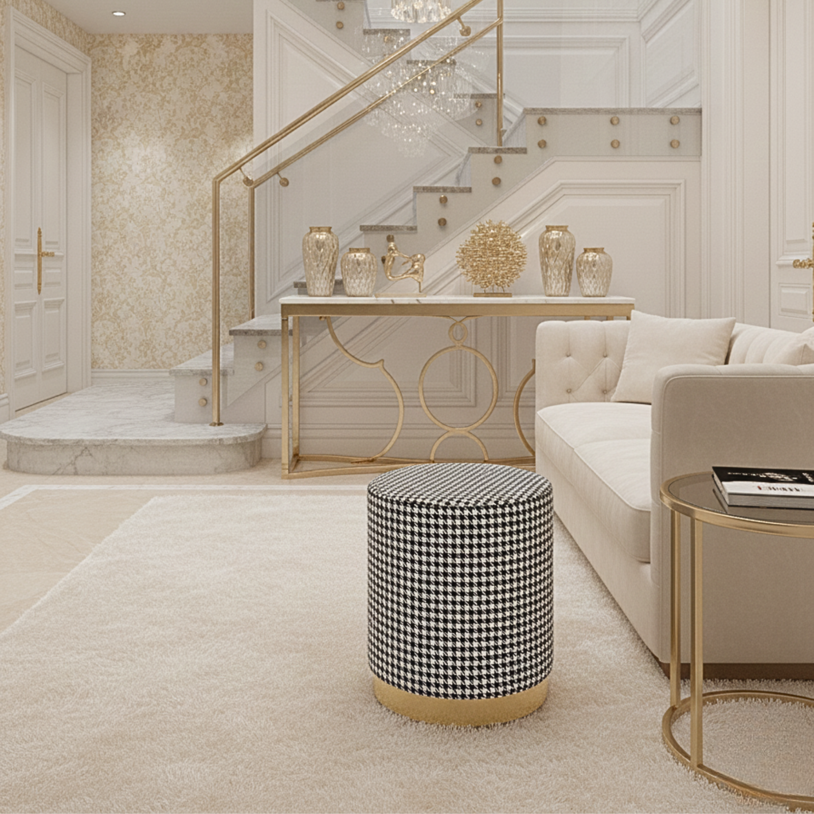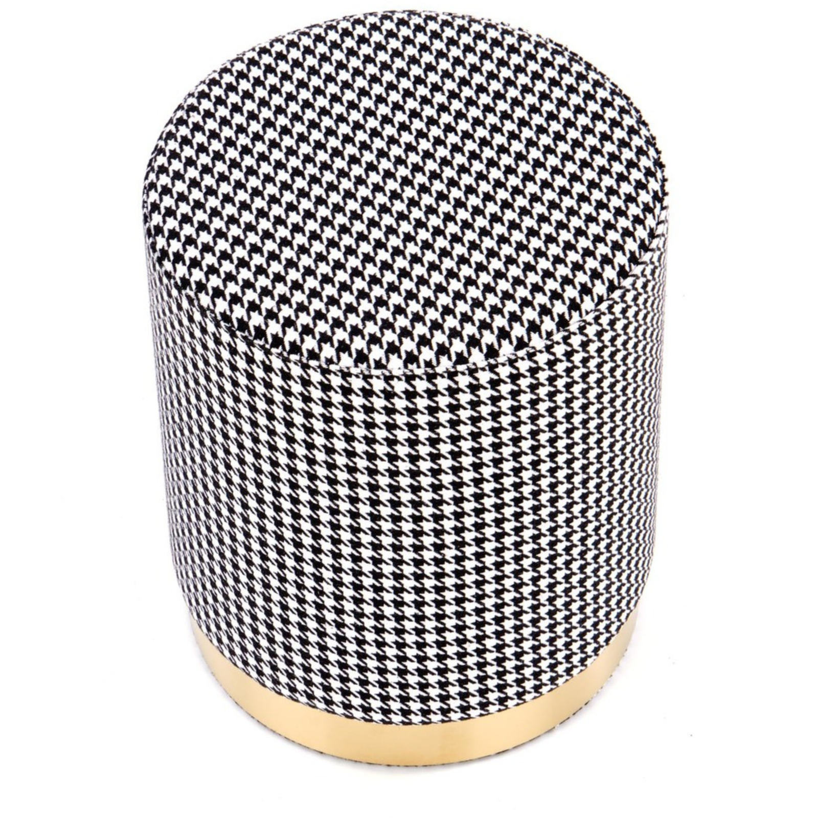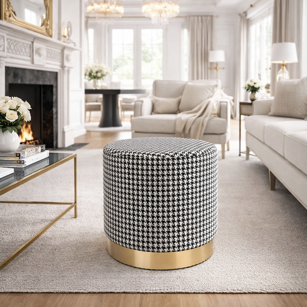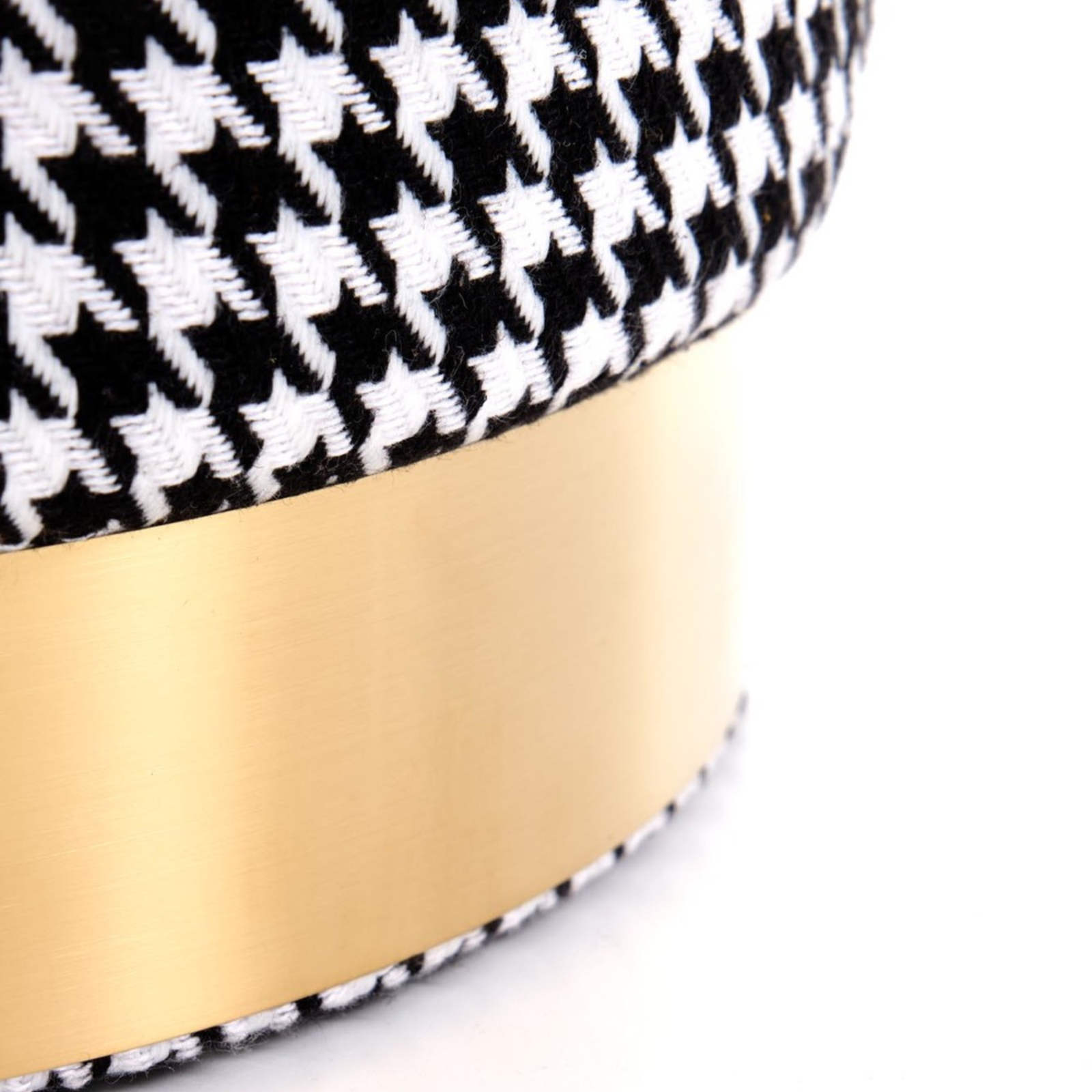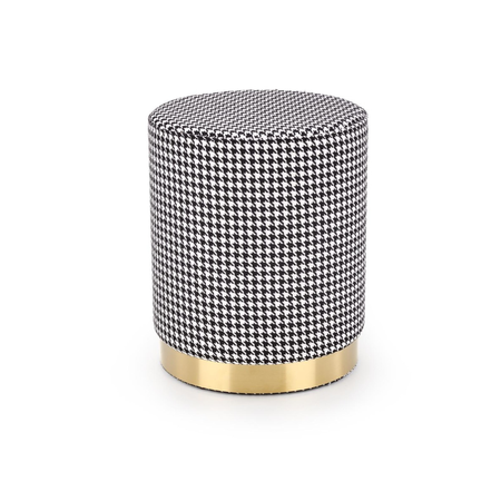 Pufa MELISA to elegancki mebel o okrągłej formie, który doskonale łączy funkcjonalność z dekoracyjnym charakterem. Obicie z tkaniny w klasyczną czarno-białą pepitkę przyciąga wzrok i nadaje wnętrzu wyrafinowanego stylu, natomiast stabilna podstawa wykonana ze stali chromowanej w kolorze złotym podkreśla luksusowy wygląd pufy. To idealny dodatek do wnętrz glamour i nowoczesnych aranżacji.