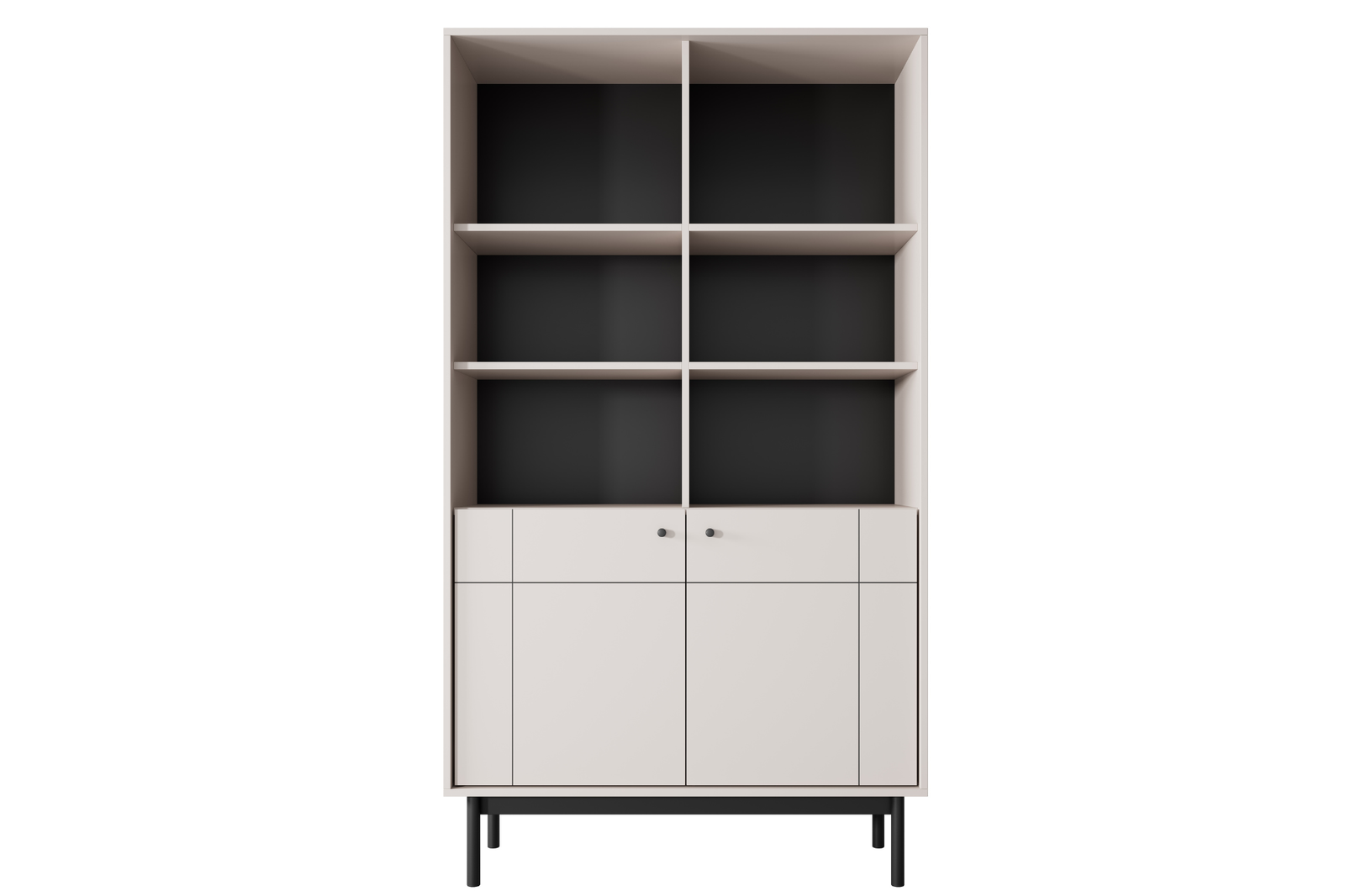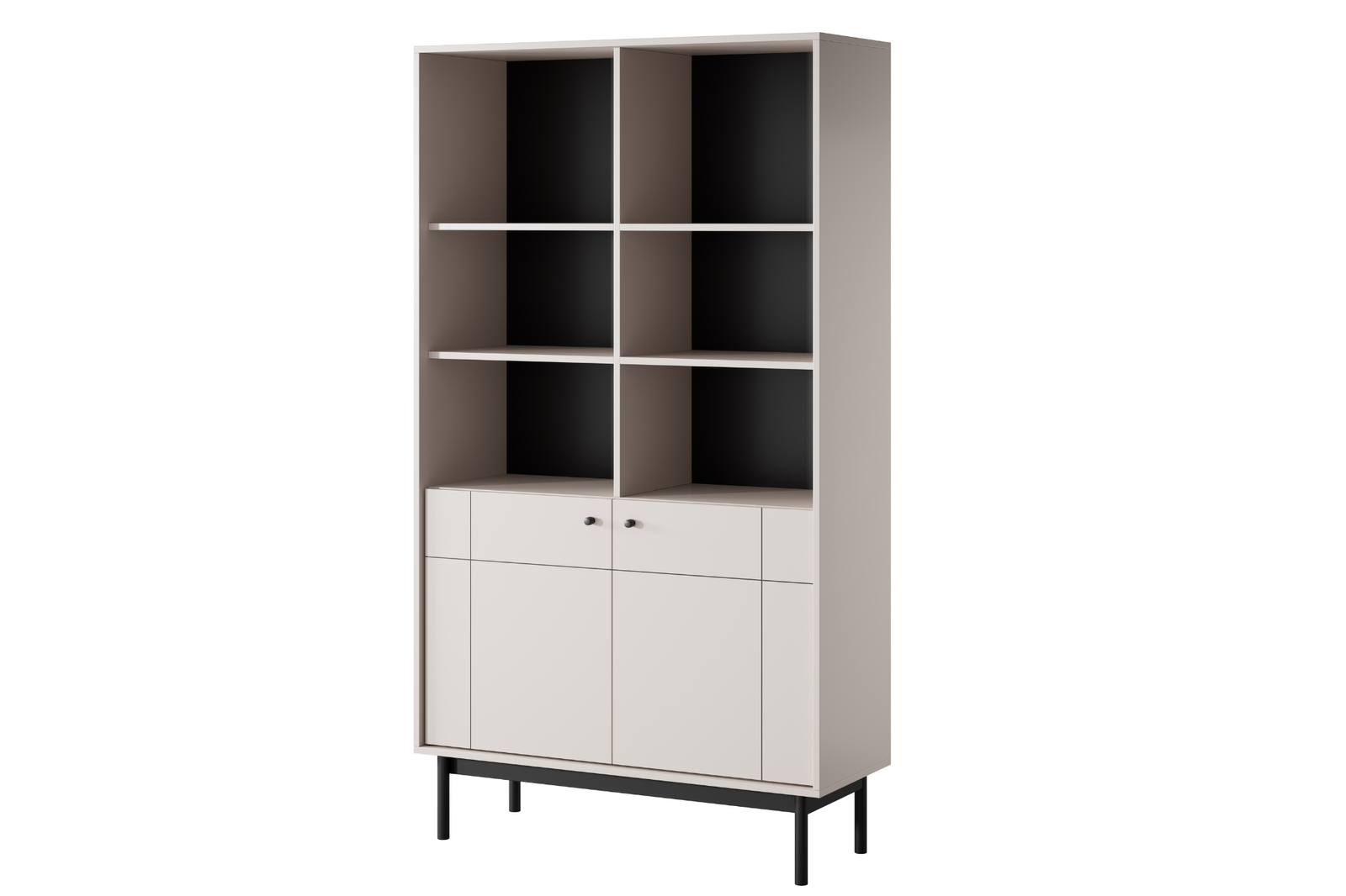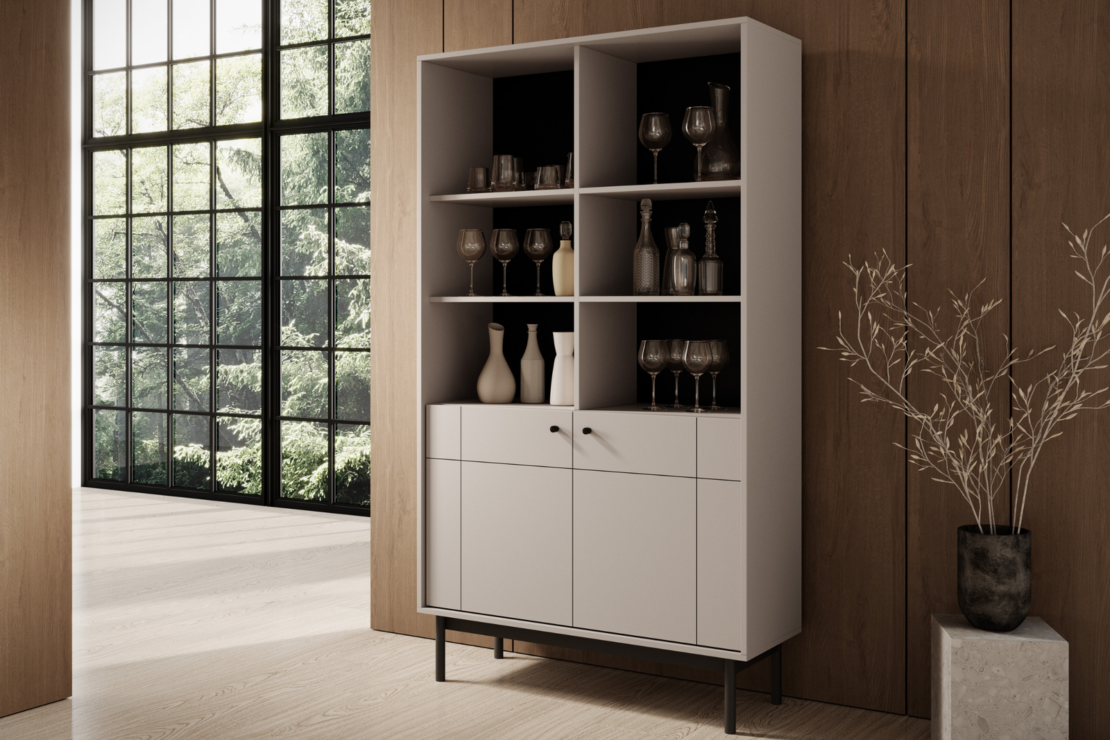 Regał SILEN został zaprojektowany tak, by łączyć styl z praktycznością. Wysoka forma mebla i otwarte półki pozwalają na efektowne wyeksponowanie książek, dekoracji czy roślin. Drewniane nogi malowane na czarno zapewniają stabilność i równowagę, jednocześnie nadając całości lekkości. Czarne, metalowe uchwyty w formie gałek stanowią elegancki akcent, który idealnie dopełnia nowoczesny design. Dzięki starannemu wykończeniu i gładkim powierzchniom mebel jest łatwy w utrzymaniu czystości, co zwiększa komfort codziennego użytkowania.
