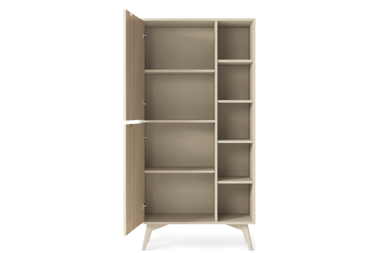• Regał Vinora w beżowym odcieniu boho zachwyca matowym wykończeniem i frontem w jodełkę scandi, dodając wnętrzu ciepła i elegancji.