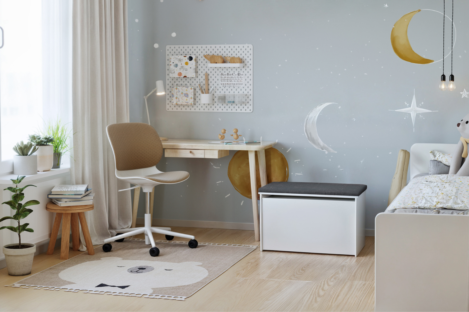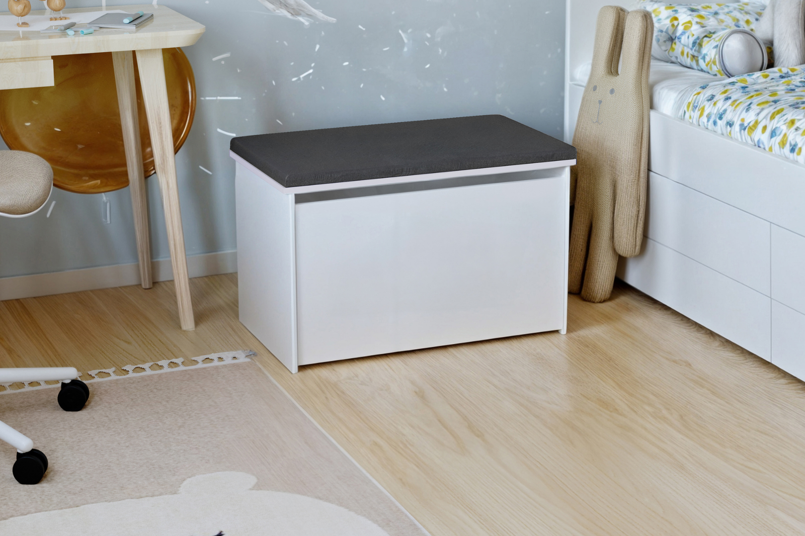 Skrzynia na zabawki lub inne skarby dziecka oferuje pojemne miejsce do przechowywania zarówno małych, jak i większych przedmiotów. Schowane we wnętrzu kufra rzeczy pozostają łatwo dostępne, ale ukryte przed wzrokiem, co ułatwia utrzymanie porządku w pokoju najmłodszych. Zastosowany w otwieranej do góry klapie skrzyni, łatwy w obsłudze podnośnik, zapewnia dzieciom wygodny dostęp do wnętrza, wspierając ich rozwój oraz samodzielność. Panel tapicerowany na pokrywie, nie tylko dodaje przytulności wnętrzu, ale również staje się wygodnym siedziskiem.
