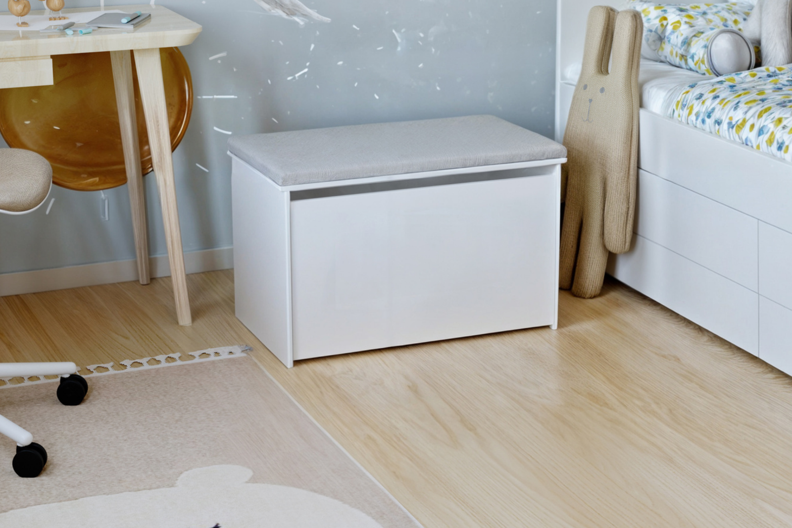Skrzynia na zabawki lub inne skarby dziecka oferuje pojemne miejsce do przechowywania zarówno małych, jak i większych przedmiotów. Schowane we wnętrzu kufra rzeczy pozostają łatwo dostępne, ale ukryte przed wzrokiem, co ułatwia utrzymanie porządku w pokoju najmłodszych. Zastosowany w otwieranej do góry klapie skrzyni, łatwy w obsłudze podnośnik, zapewnia dzieciom wygodny dostęp do wnętrza, wspierając ich rozwój oraz samodzielność. Panel tapicerowany na pokrywie, nie tylko dodaje przytulności wnętrzu, ale również staje się wygodnym siedziskiem.