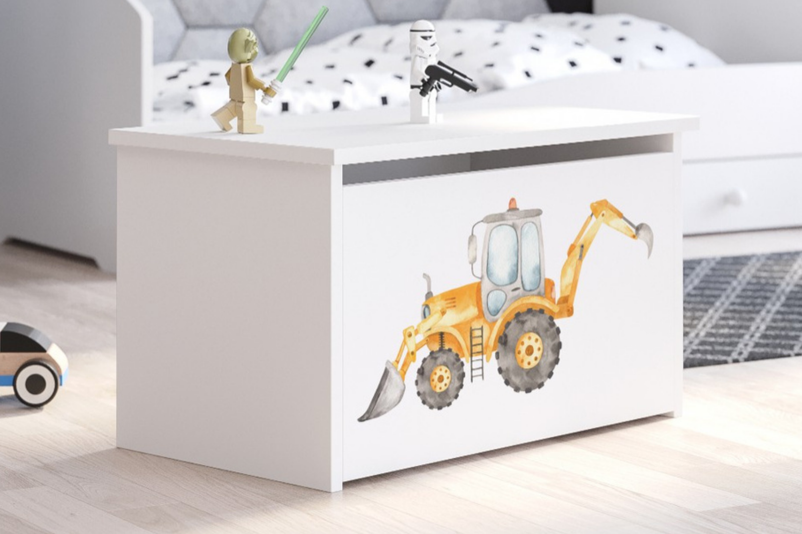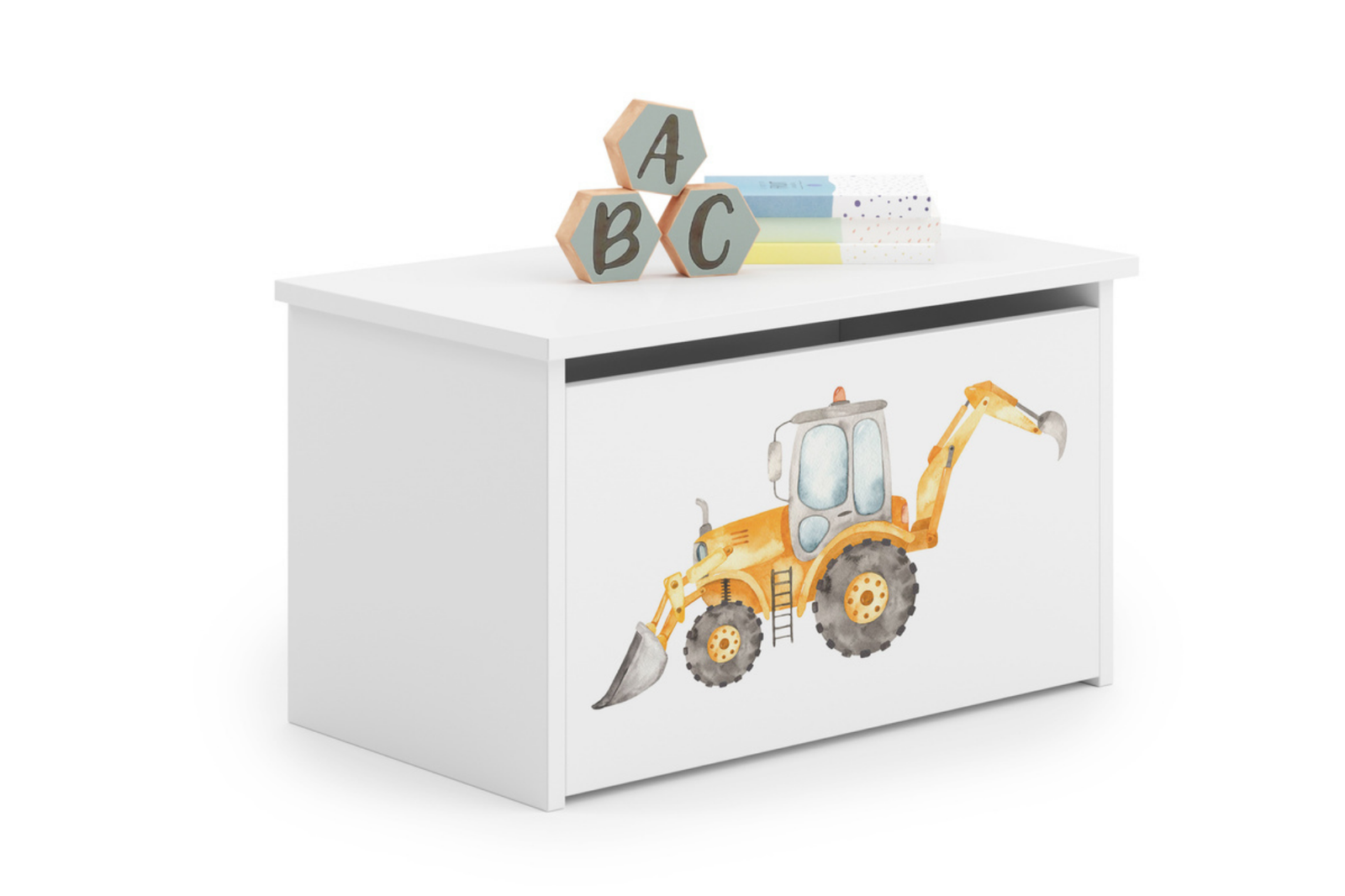 Skrzynię cechuje staranne wykonanie z dbałością o każdy detal. Kufer wykonany został z płyty meblowej laminowanej obustronnie, co zapewnia solidność i odporność na zarysowania. Klapa otwierana jest do góry za sprawą podnośnika gazowego. Wnętrze skrzyni zapewnia mnóstwo miejsca na rzeczy o zróżnicowanej wielkości. Biały kolor ułatwia dopasowanie aranżacyjne, a kolorowa grafika nadrukowana metodą UV zapewnia trwałość na ścieranie i stanowi piękną dekorację, nadając skrzyni wyjątkowego charakteru. Dzięki skrzyni na zabawki sprzątanie pokoju stanie się dziecinnie proste.