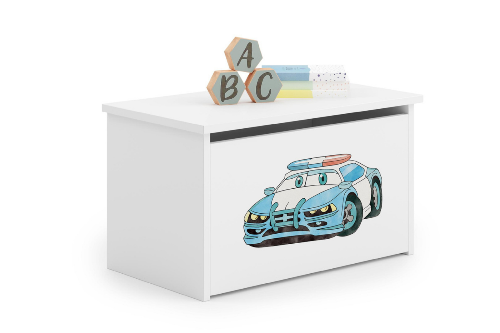 Skrzynię cechuje staranne wykonanie z dbałością o każdy detal. Kufer wykonany został z płyty meblowej laminowanej obustronnie, co zapewnia solidność i odporność na zarysowania. Klapa otwierana jest do góry za sprawą podnośnika gazowego. Wnętrze skrzyni zapewnia mnóstwo miejsca na rzeczy o zróżnicowanej wielkości. Biały kolor ułatwia dopasowanie aranżacyjne, a kolorowa grafika nadrukowana metodą UV zapewnia trwałość na ścieranie i stanowi piękną dekorację, nadając skrzyni wyjątkowego charakteru. Dzięki skrzyni na zabawki sprzątanie pokoju stanie się dziecinnie proste.