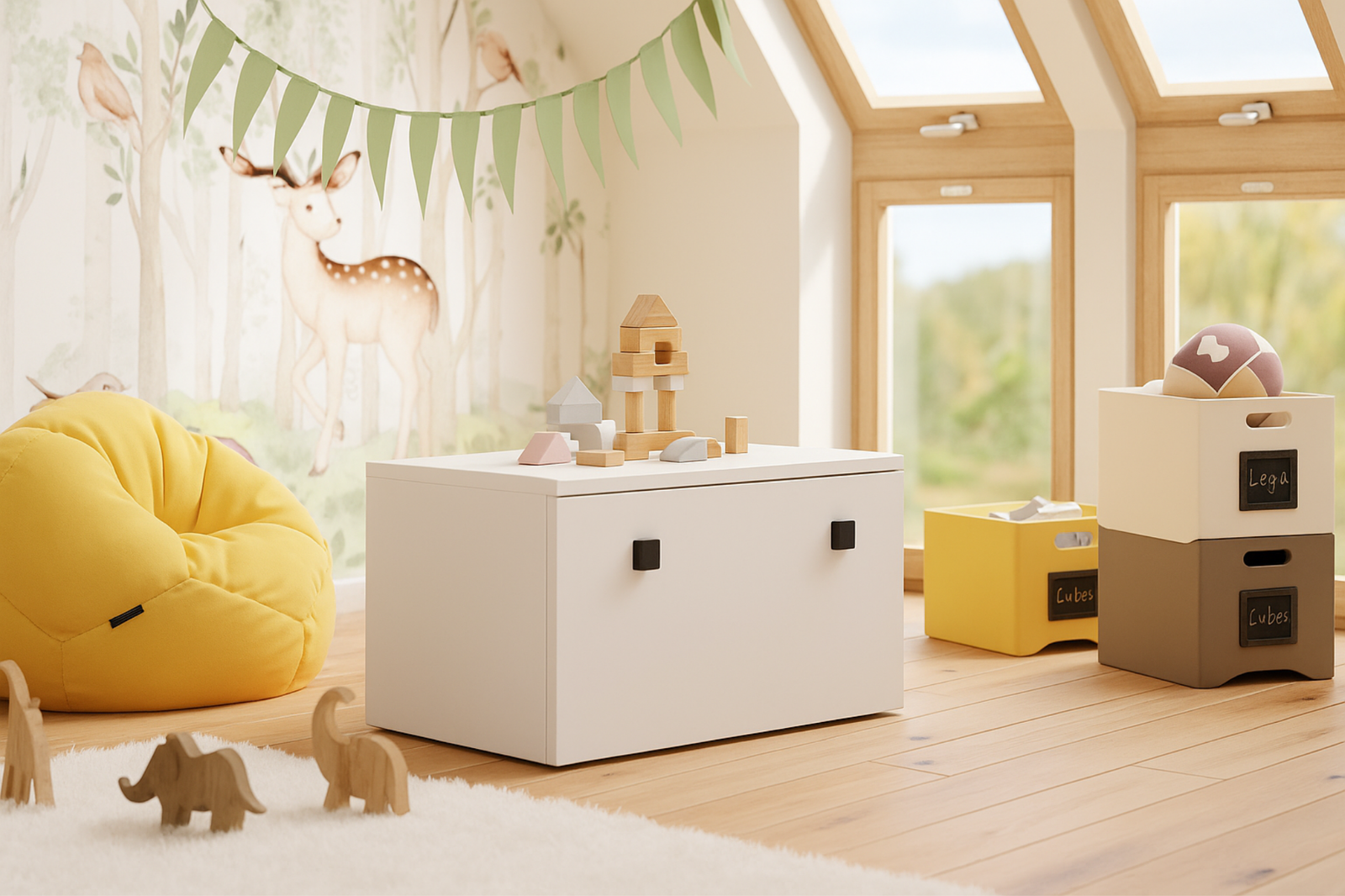 • Skrzynia na zabawki to mebel, którego nie może zabraknąć w pokoju dziecięcym. Kufer posiada pojemną szufladę, w której najmłodsi mogą przechowywać swoje skarby.