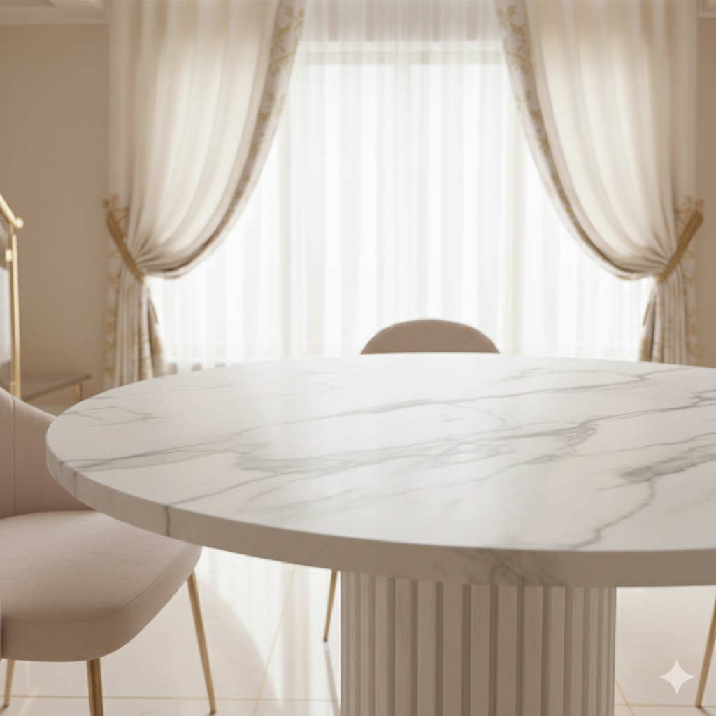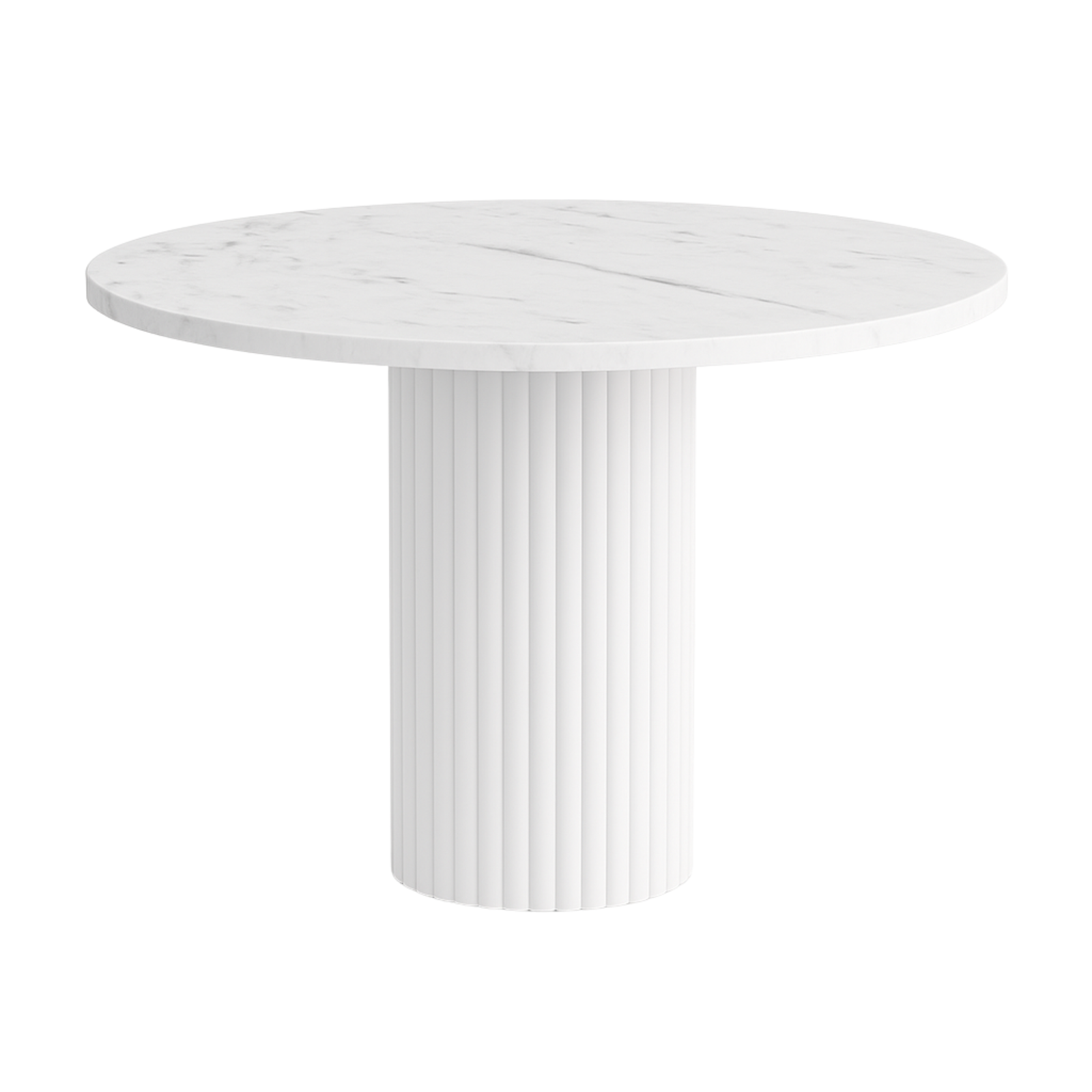 Stół VENTI to połączenie nowoczesnego stylu i ponadczasowej elegancji. Stabilna, biała podstawa dodaje mu lekkości, a okrągły blat z laminatu w dekorze białego marmuru prezentuje się wyjątkowo estetycznie i jest odporny na codzienne użytkowanie. To doskonały wybór do wspólnych posiłków, rodzinnych rozmów oraz jako centralny punkt wnętrza o podwyższonym standardzie.