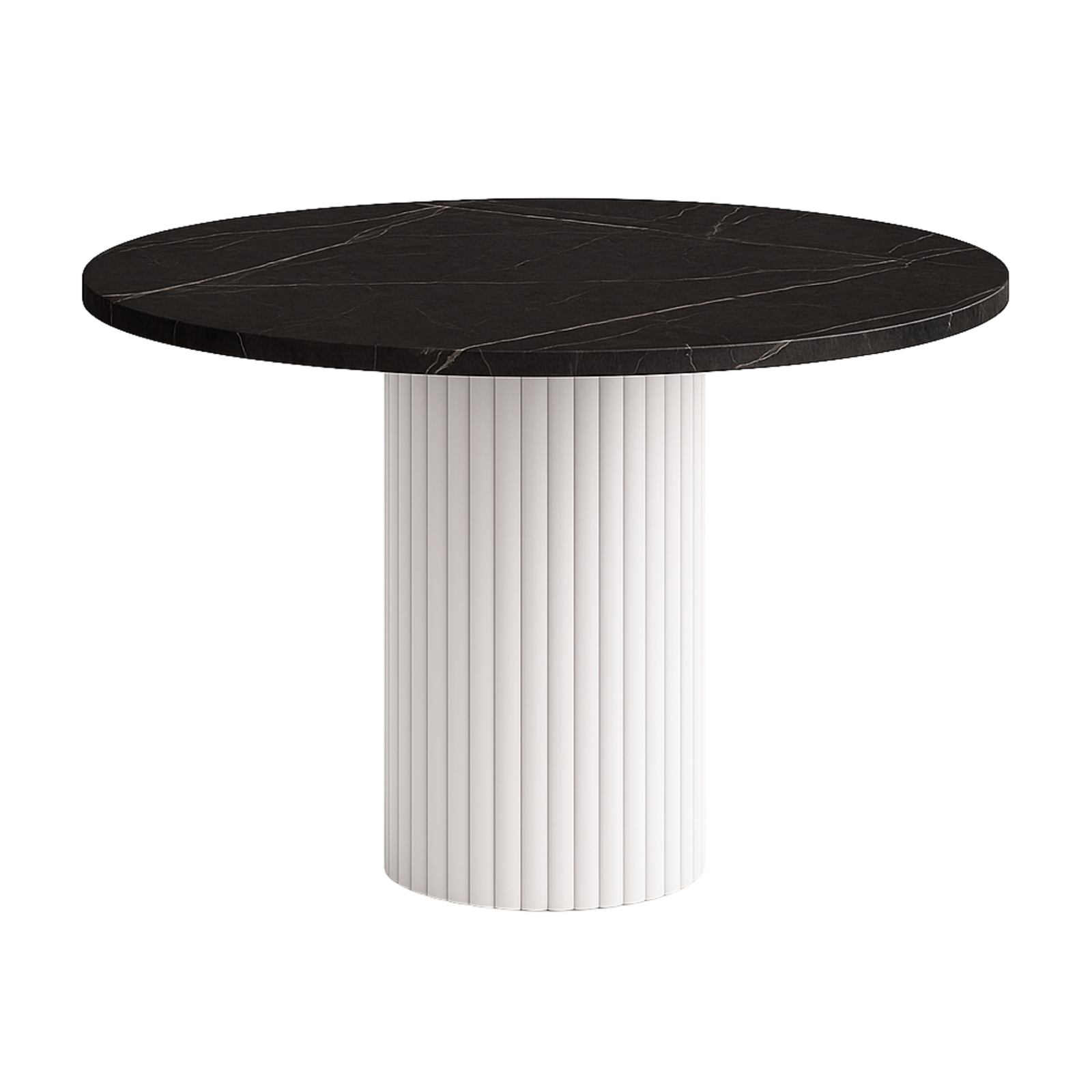 • Okrągły blat z trwałego laminatu w dekorze czarnego marmuru.