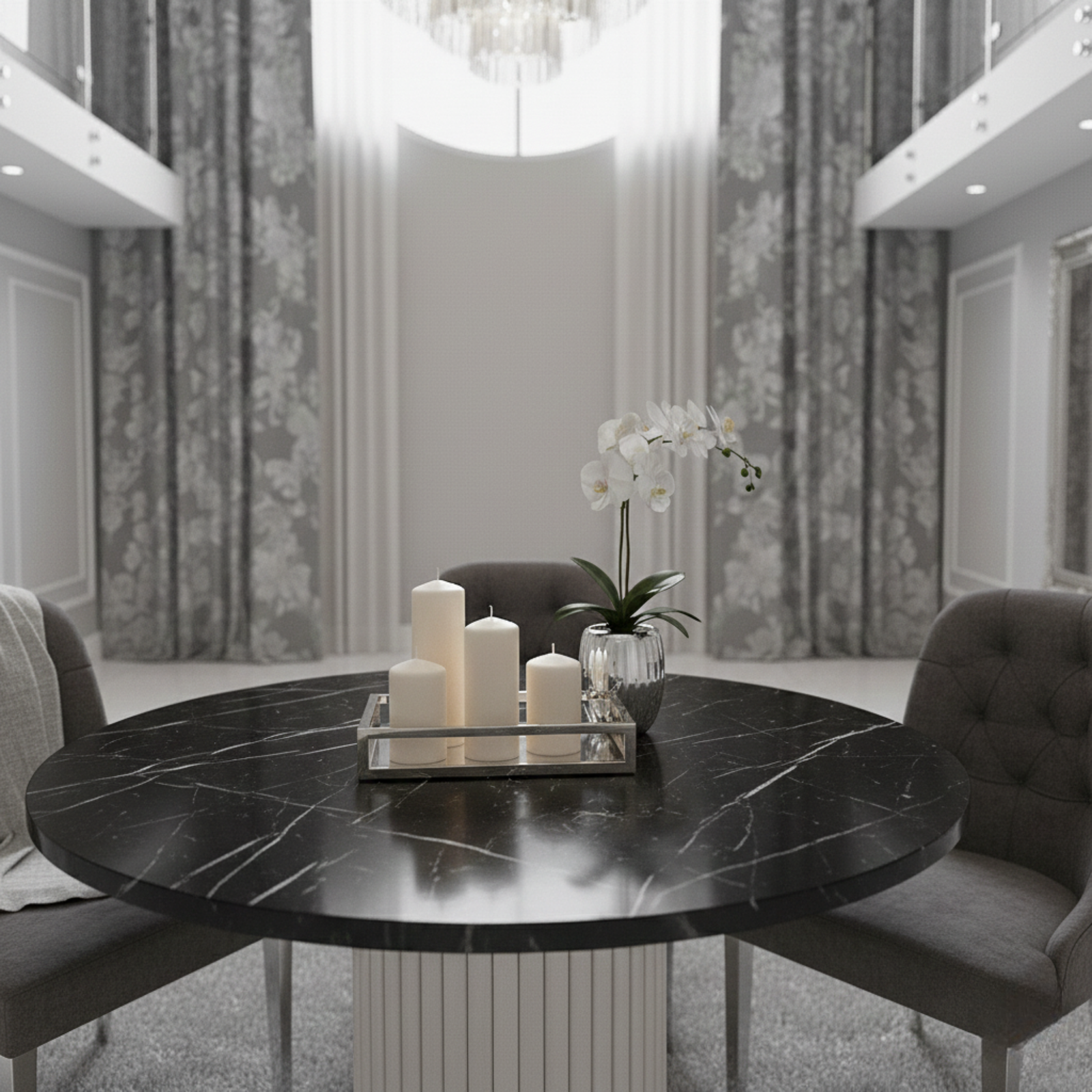 Stół VENTI to elegancki, nowoczesny model, który zachwyca połączeniem minimalistycznej formy i solidnego wykonania. Biała metalowa podstawa nadaje mu lekkości i klasy, a okrągły blat z trwałego laminatu w dekorze czarnego marmuru jest odporny na codzienne użytkowanie i zachowuje efektowny wygląd przez lata. VENTI świetnie sprawdzi się jako centralny element wnętrza — zarówno przy codziennych posiłkach, jak i podczas wspólnych spotkań.