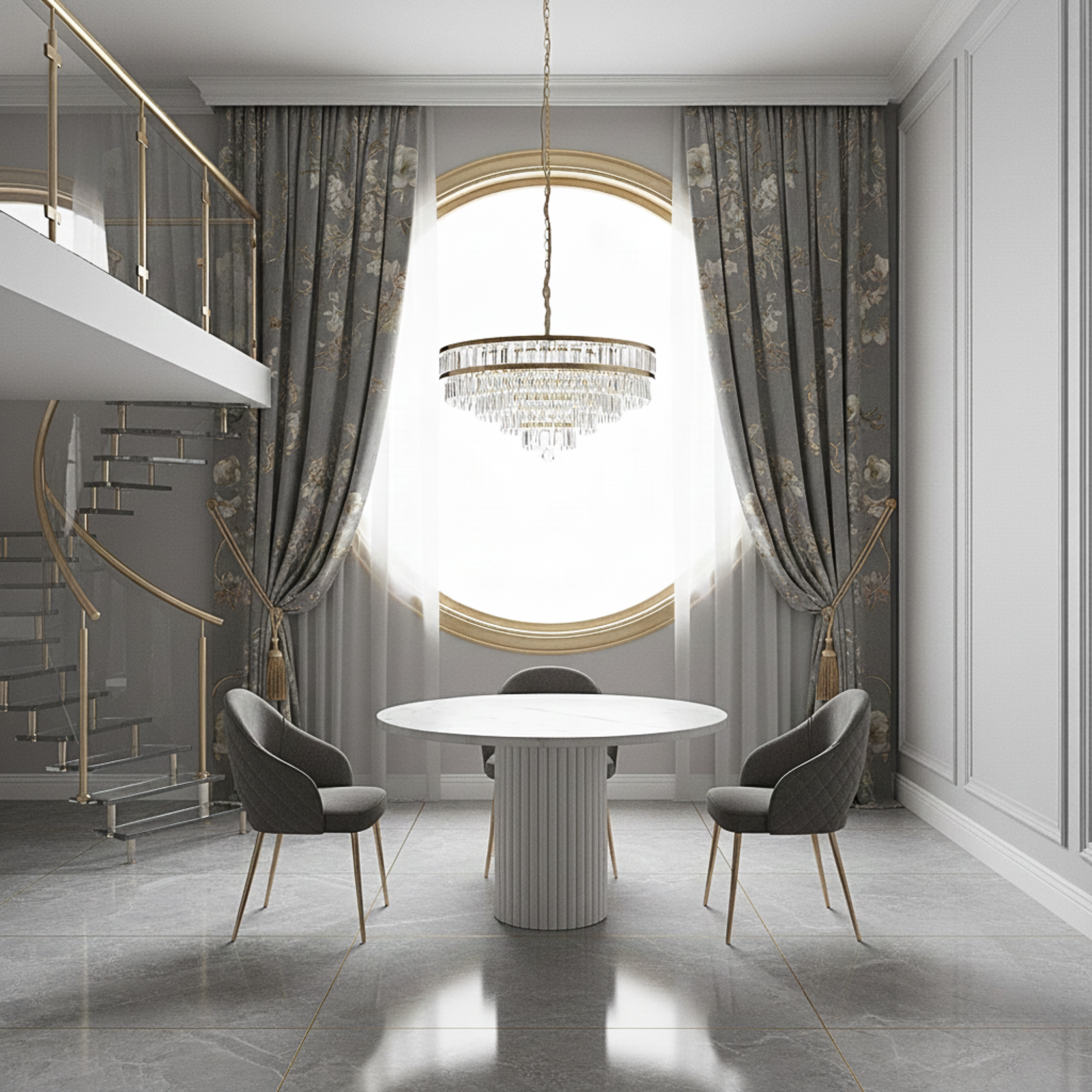 • Stół VENTI to elegancki, nowoczesny mebel z okrągłym blatem w dekorze białego marmuru, który doskonale dopełni wystrój salonu, kuchni lub jadalni.