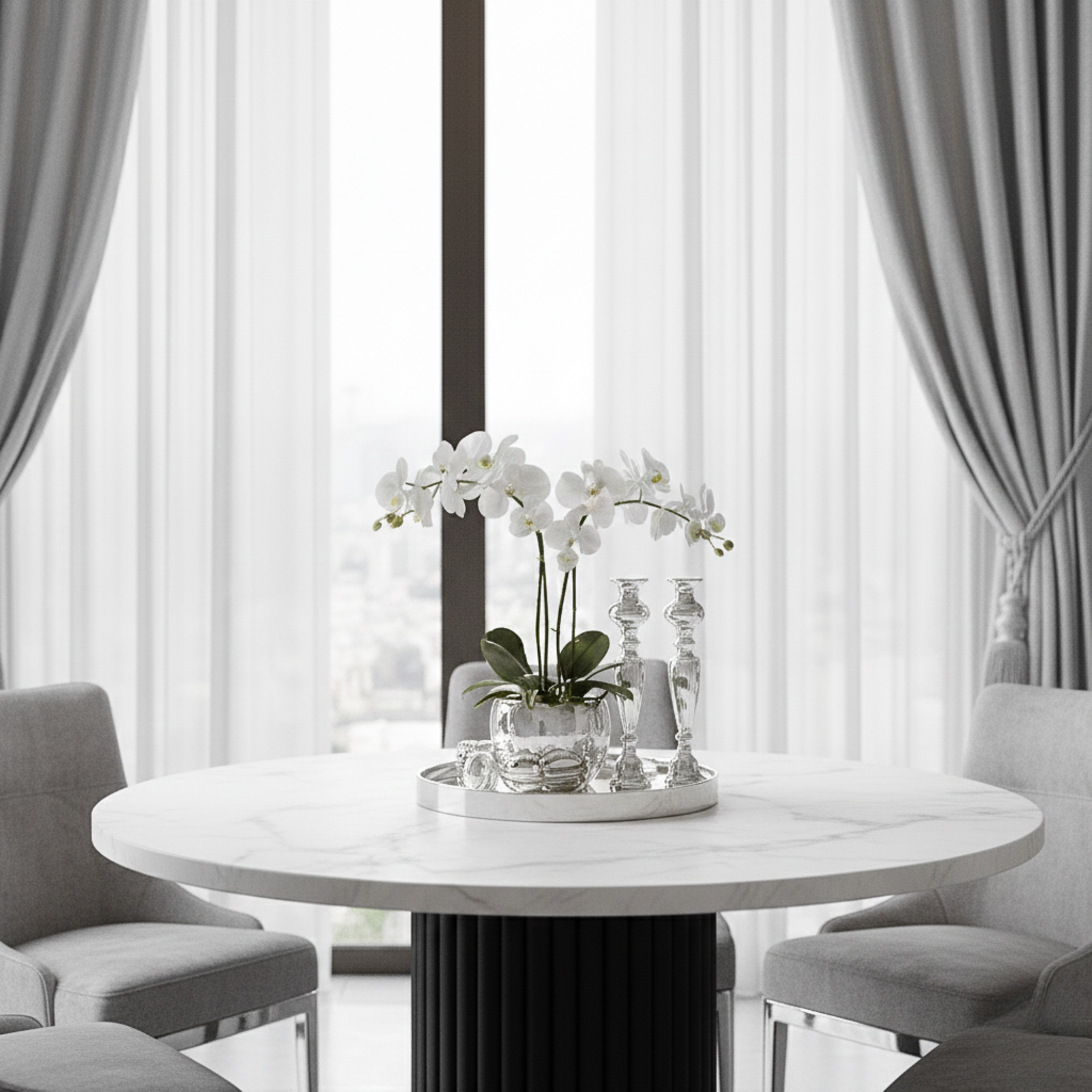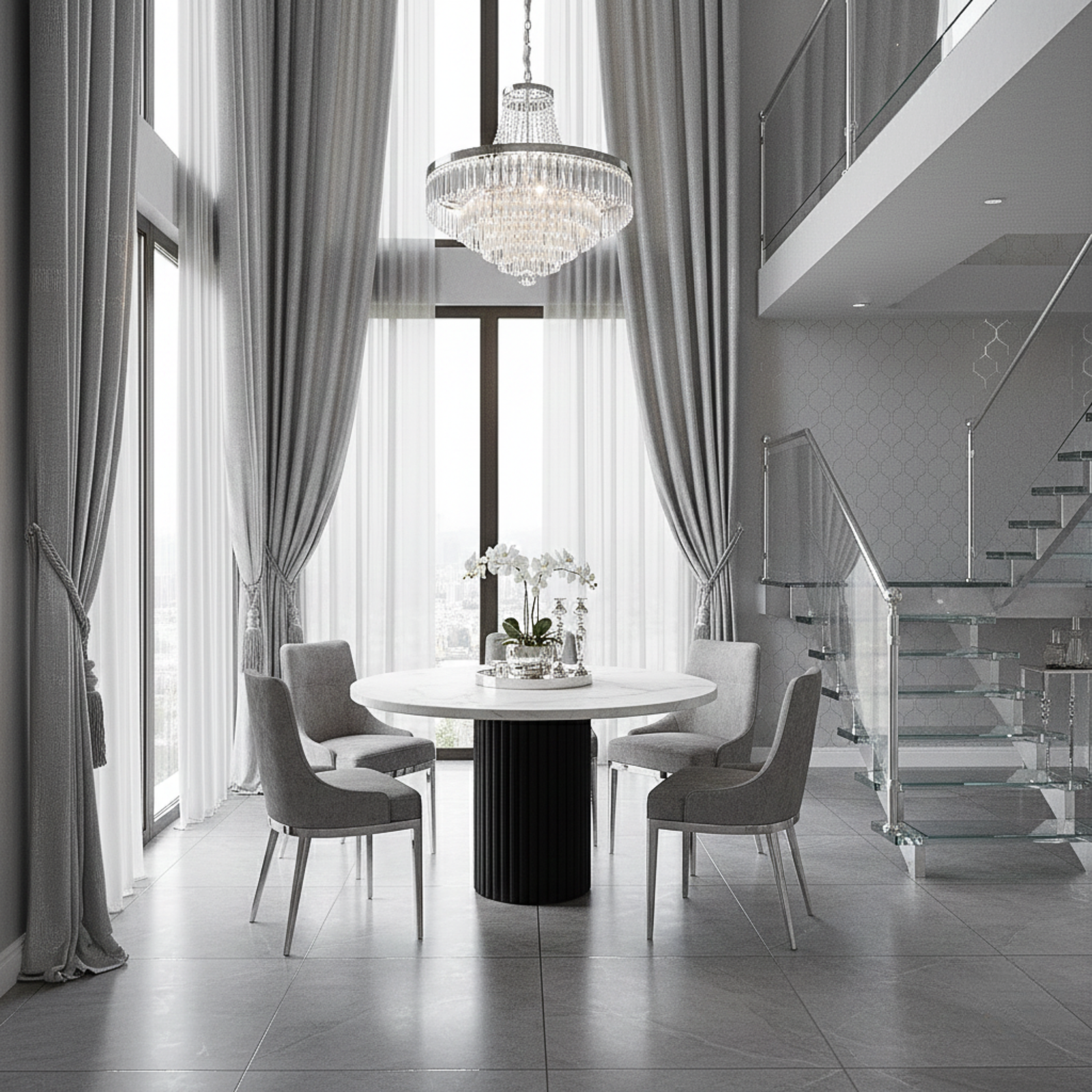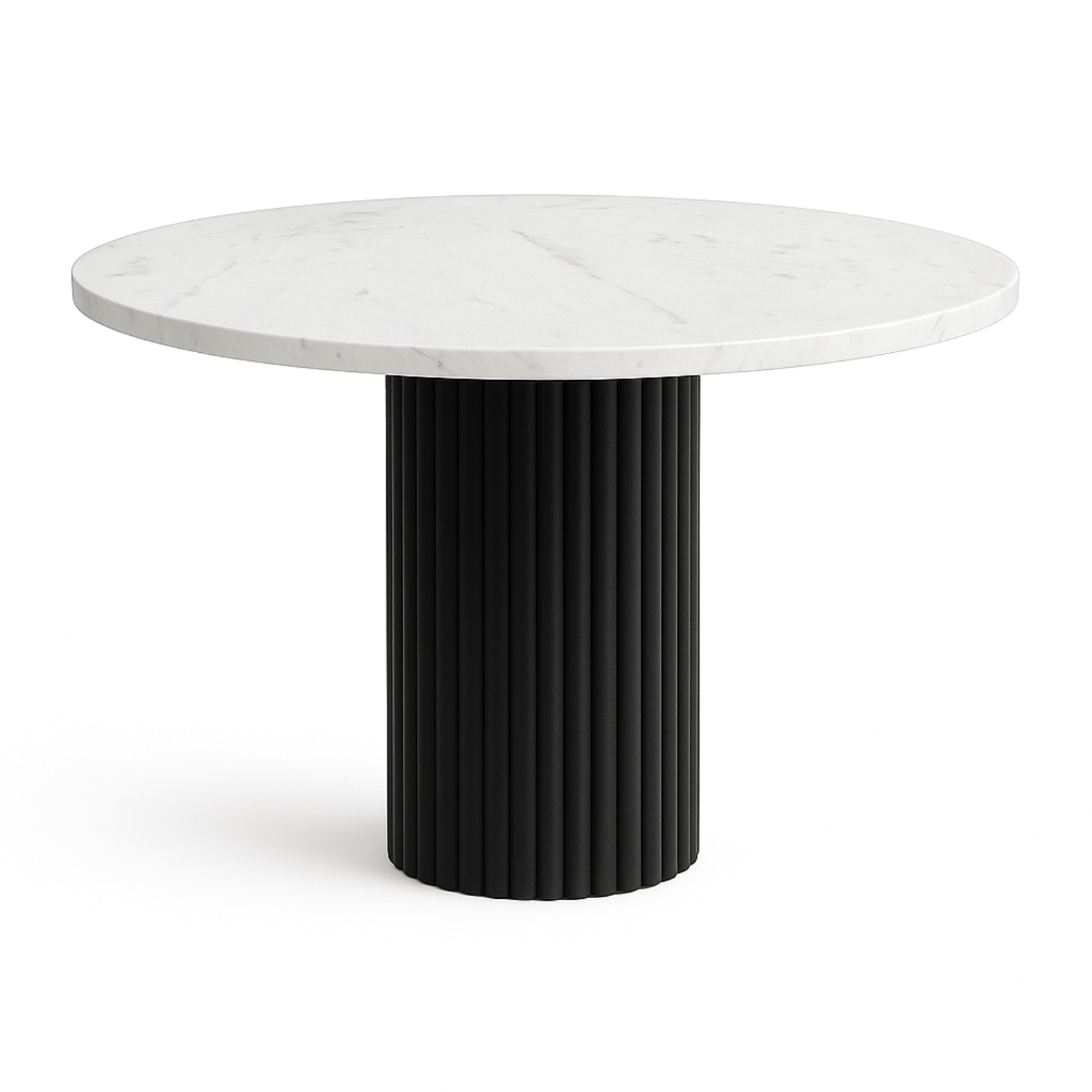 Stół VENTI to połączenie współczesnej estetyki z funkcjonalnością. Okrągły blat w kolorze białego marmuru pięknie kontrastuje z czarną, ryflowaną podstawą, nadając wnętrzu stylowego charakteru. Dzięki przemyślanej formie model ten sprawdzi się zarówno podczas codziennych posiłków, jak i przy spotkaniach w większym gronie.