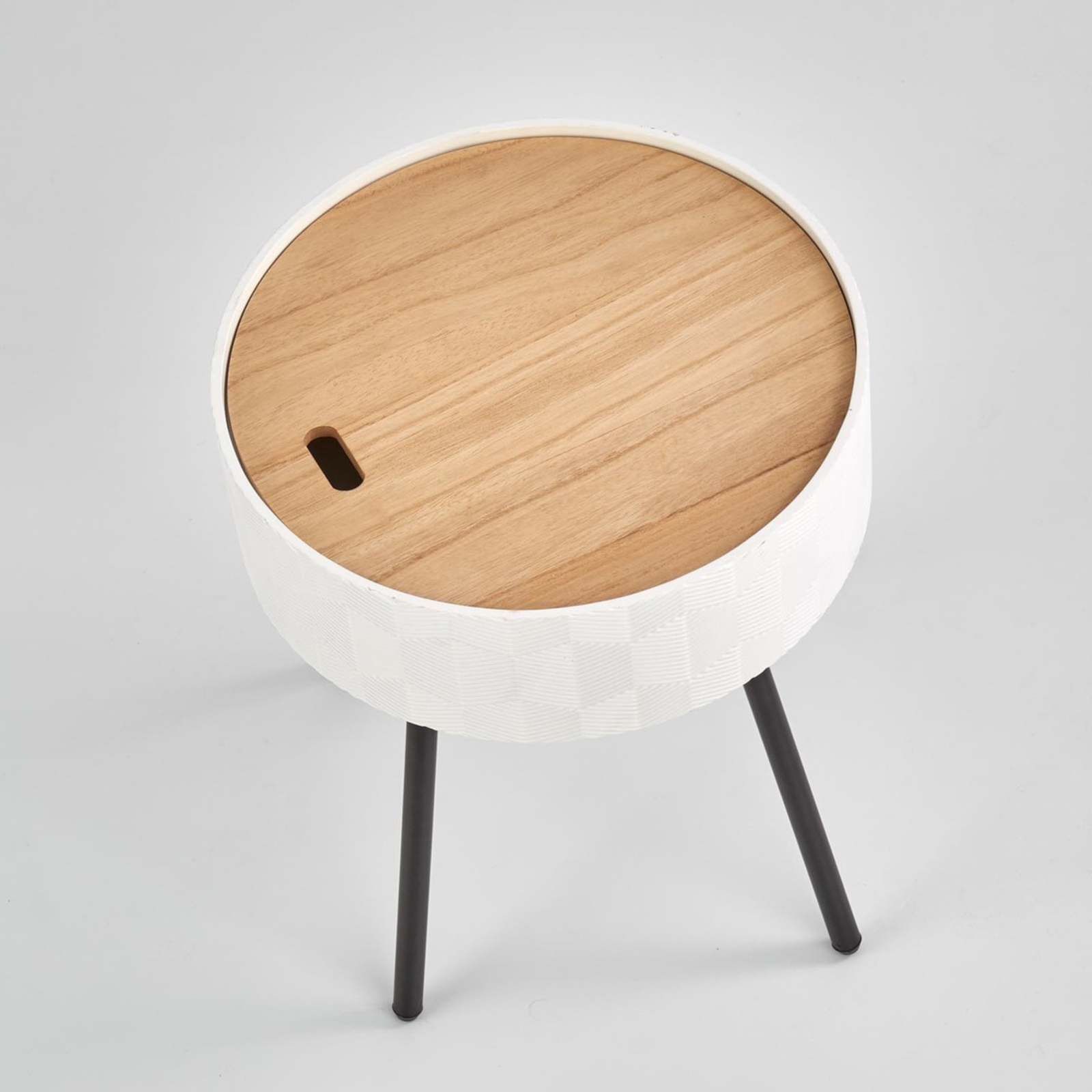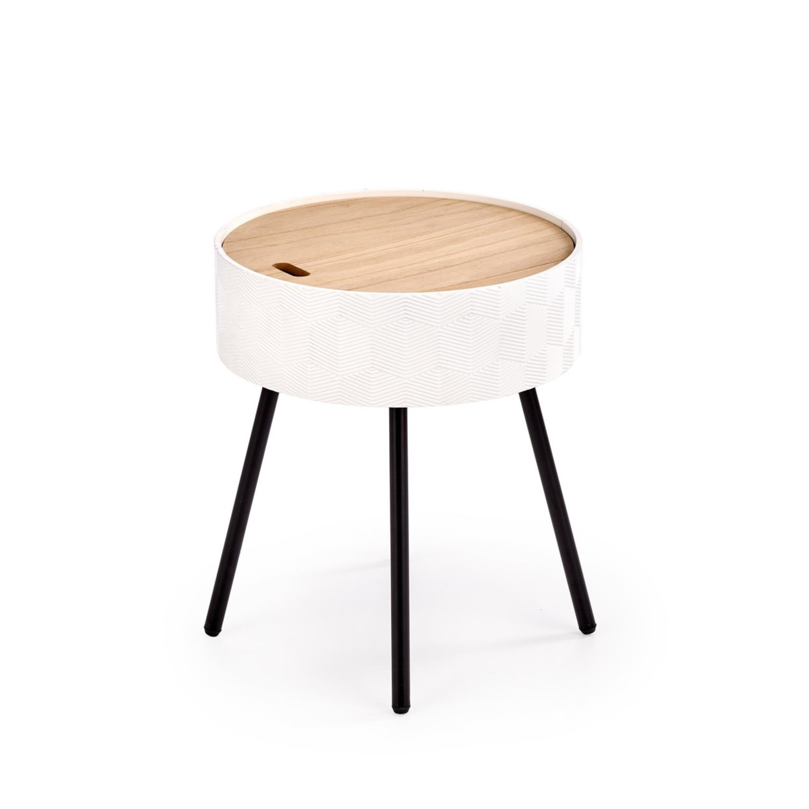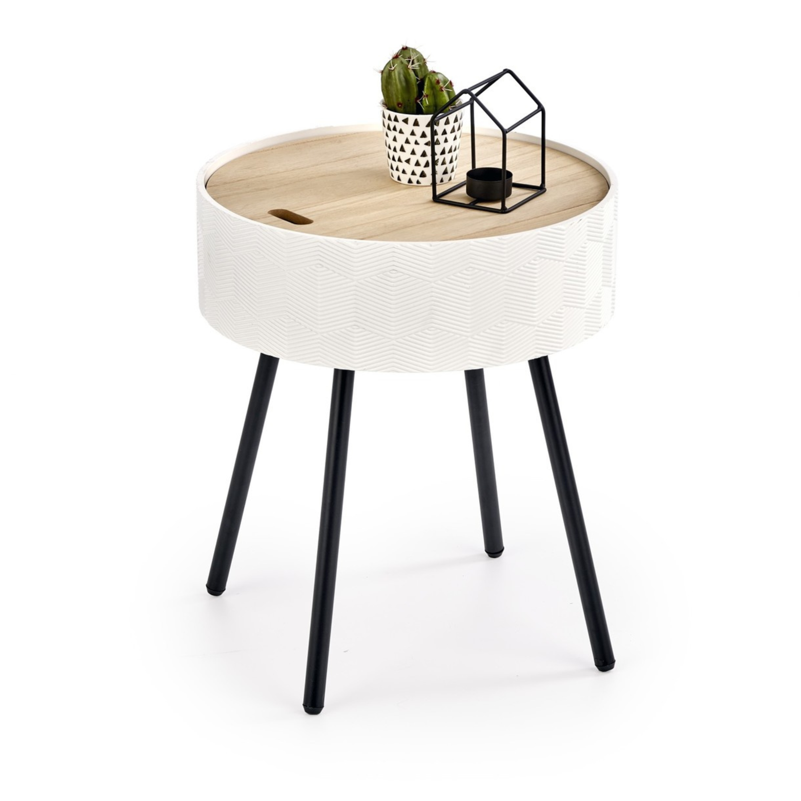 Stolik INESS został wykonany z wysokiej jakości materiałów – lakierowanego MDF-u oraz stali malowanej proszkowo, co zapewnia trwałość i odporność na codzienne użytkowanie. Blat o matowym wykończeniu jest nie tylko elegancki, ale również łatwy w utrzymaniu czystości. Model wyposażono w praktyczny pojemnik ukryty pod blatem, idealny do przechowywania drobnych akcesoriów czy pilota. Dzięki kompaktowym wymiarom stolik doskonale sprawdzi się nawet w mniejszych pomieszczeniach, dodając im lekkości i stylu.