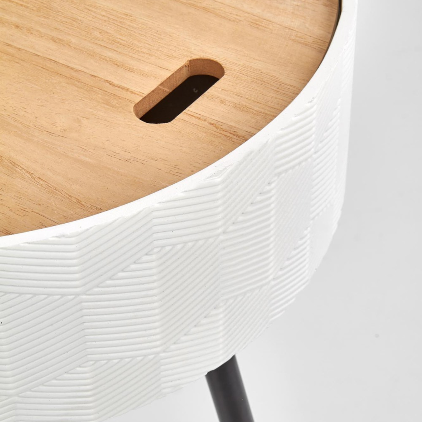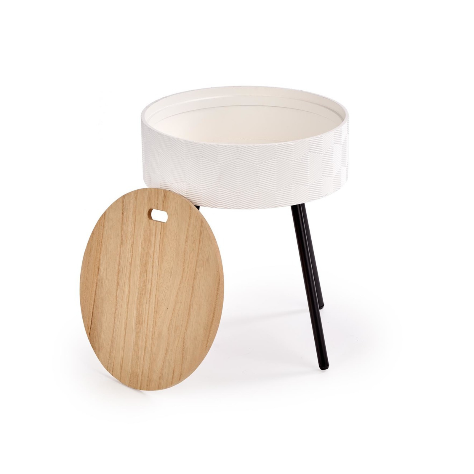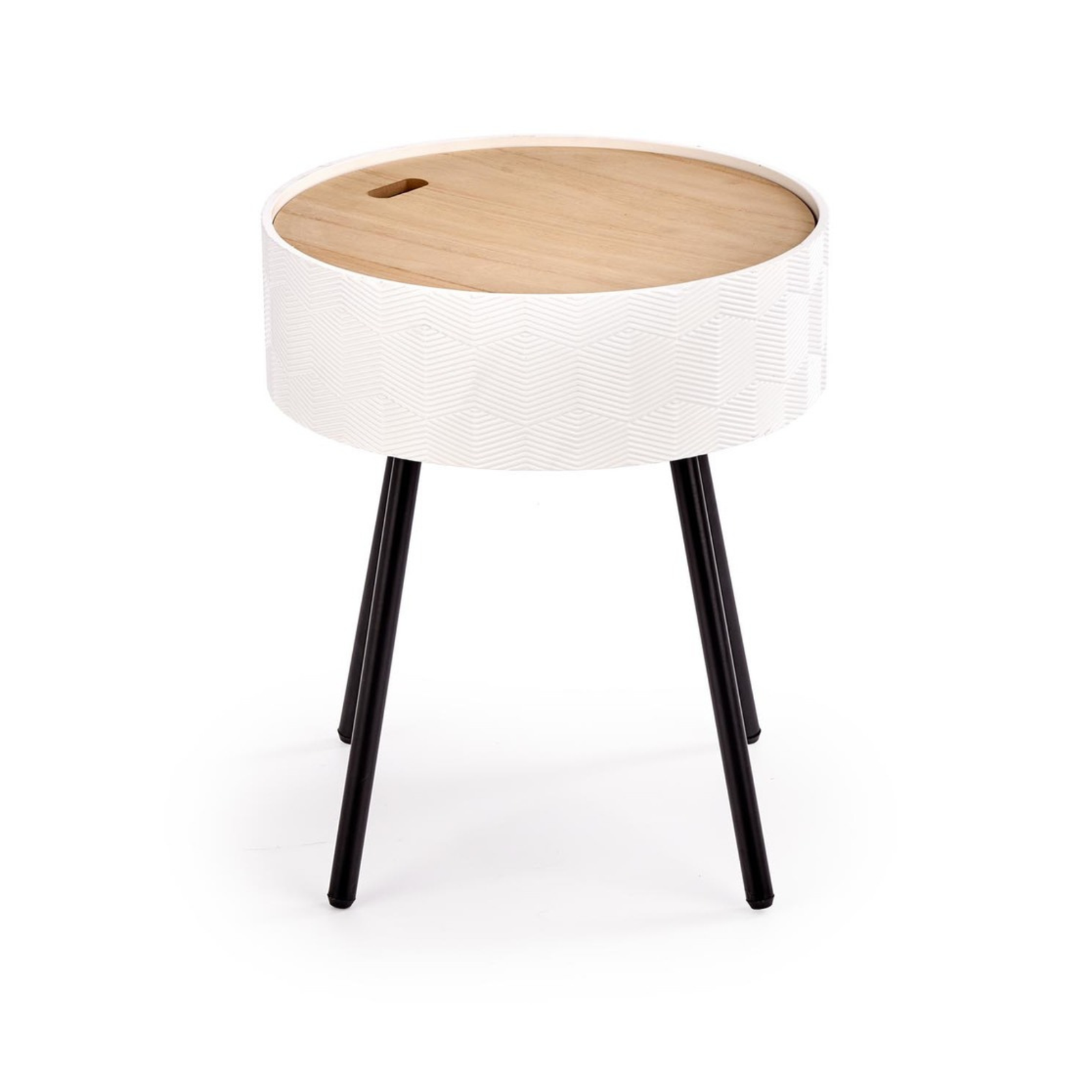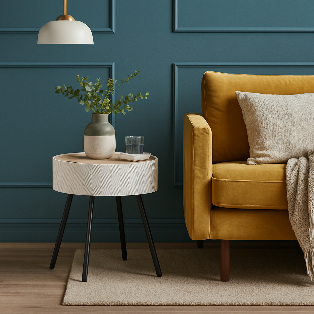 Stolik INESS został wykonany z wysokiej jakości materiałów – lakierowanego MDF-u oraz stali malowanej proszkowo, co zapewnia trwałość i odporność na codzienne użytkowanie. Blat o matowym wykończeniu jest nie tylko elegancki, ale również łatwy w utrzymaniu czystości. Model wyposażono w praktyczny pojemnik ukryty pod blatem, idealny do przechowywania drobnych akcesoriów czy pilota. Dzięki kompaktowym wymiarom stolik doskonale sprawdzi się nawet w mniejszych pomieszczeniach, dodając im lekkości i stylu.