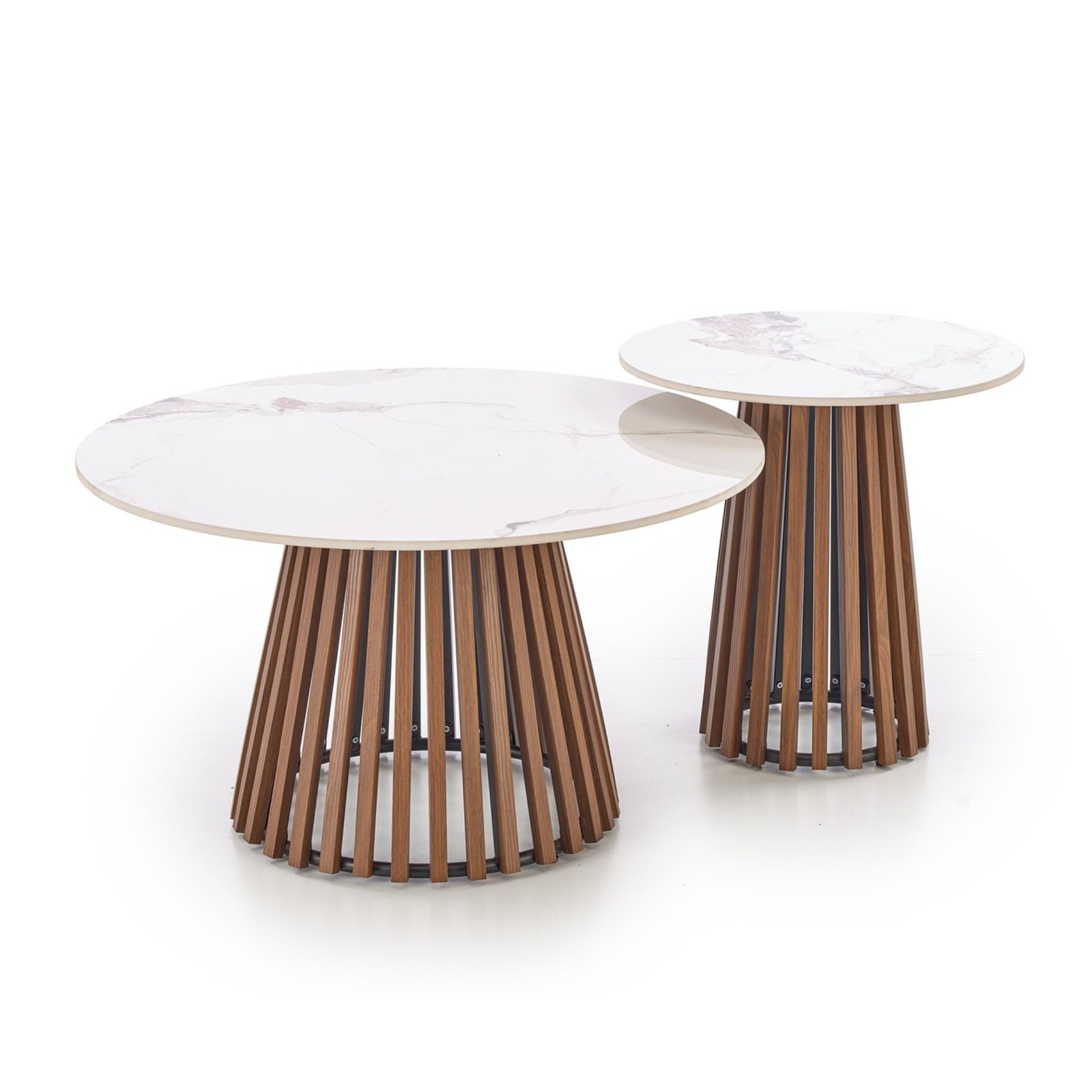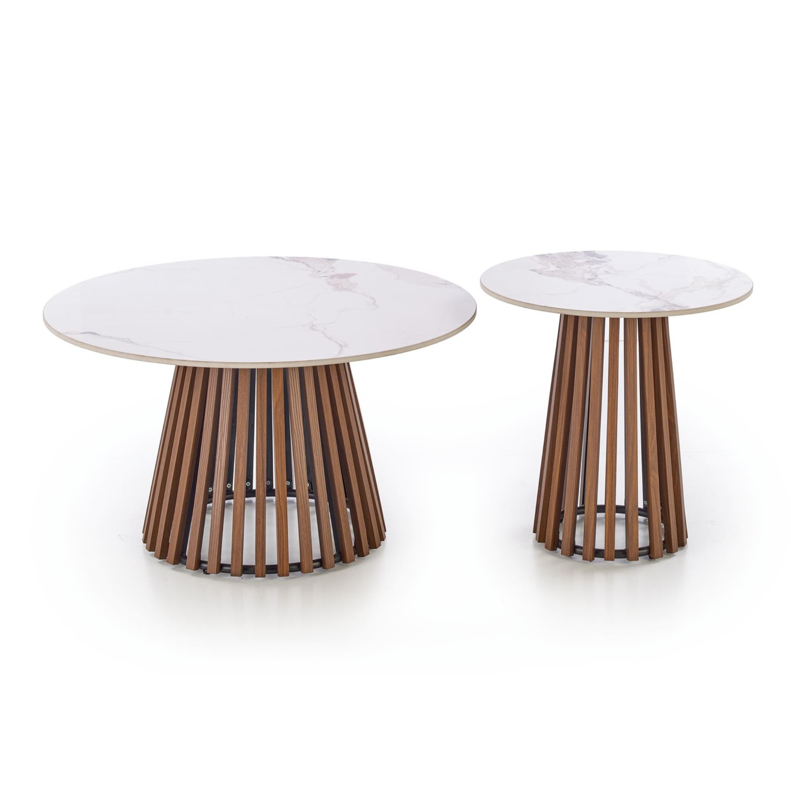Stolik kawowy ARINA został wykonany z materiałów, które gwarantują długowieczność i stabilność. Trwały spiek imitujący marmur oraz solidna podstawa z płyty MDF wykończonej okleiną w kolorze orzechowym tworzą harmonijną i odporną na uszkodzenia całość. Konstrukcja pionowych listew dodaje meblowi lekkości wizualnej i sprawia, że stolik prezentuje się wyjątkowo nowocześnie. Wybierając ARINA, zyskujesz mebel, który przez długi czas będzie ozdobą i praktycznym elementem Twojego wnętrza.