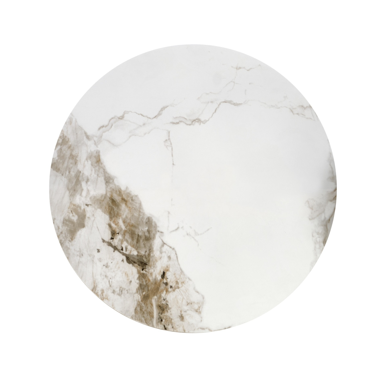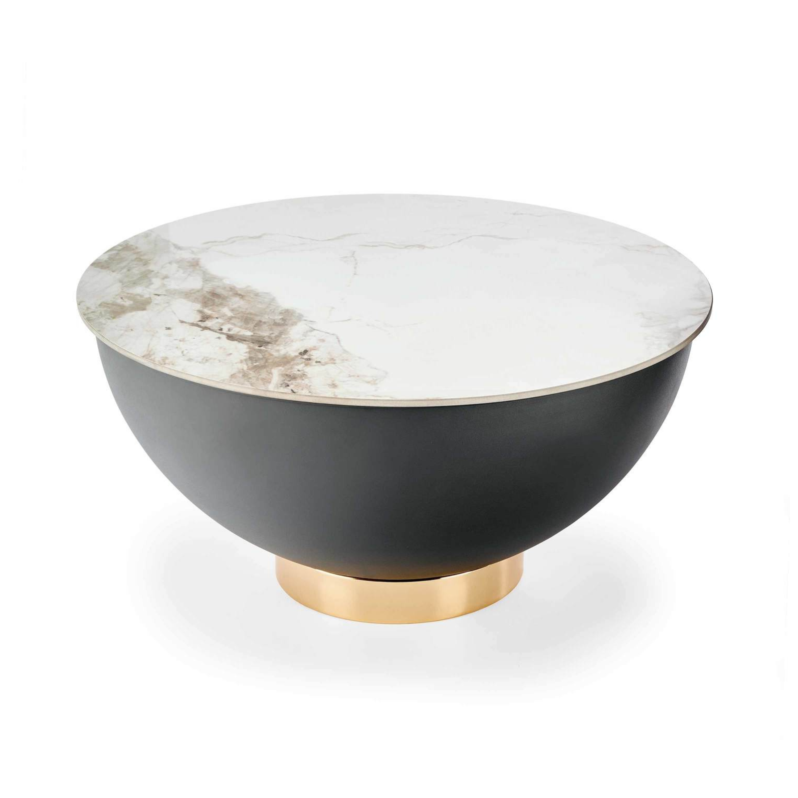 Duży, okrągły blat wykonany z ceramiki o wyglądzie białego marmuru przyciąga wzrok i dodaje przestrzeni klasy. Dzięki wyraźnemu rysunkowi marmuru oraz eleganckiemu połyskowi, mebel nabiera ekskluzywnego charakteru. Niska, stabilna podstawa z grafitowej stali z detalami w kolorze złota subtelnie podkreśla nowoczesną stylistykę stolika. To połączenie kolorów i kształtów doskonale odnajduje się w aranżacjach glamour, modern classic czy minimalistycznych.