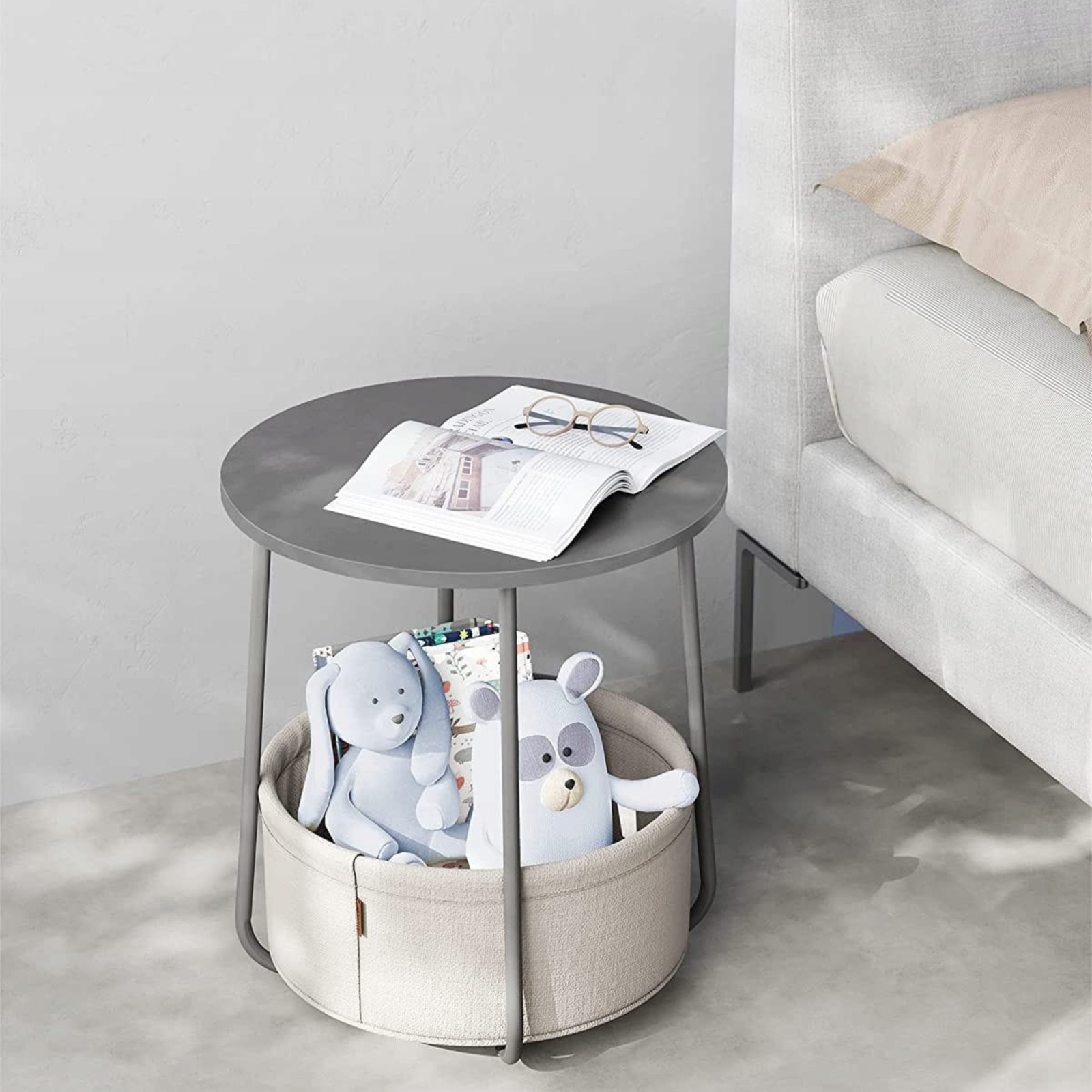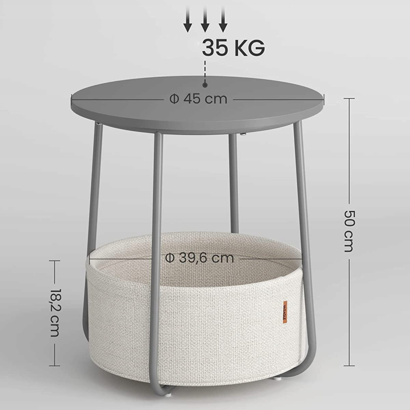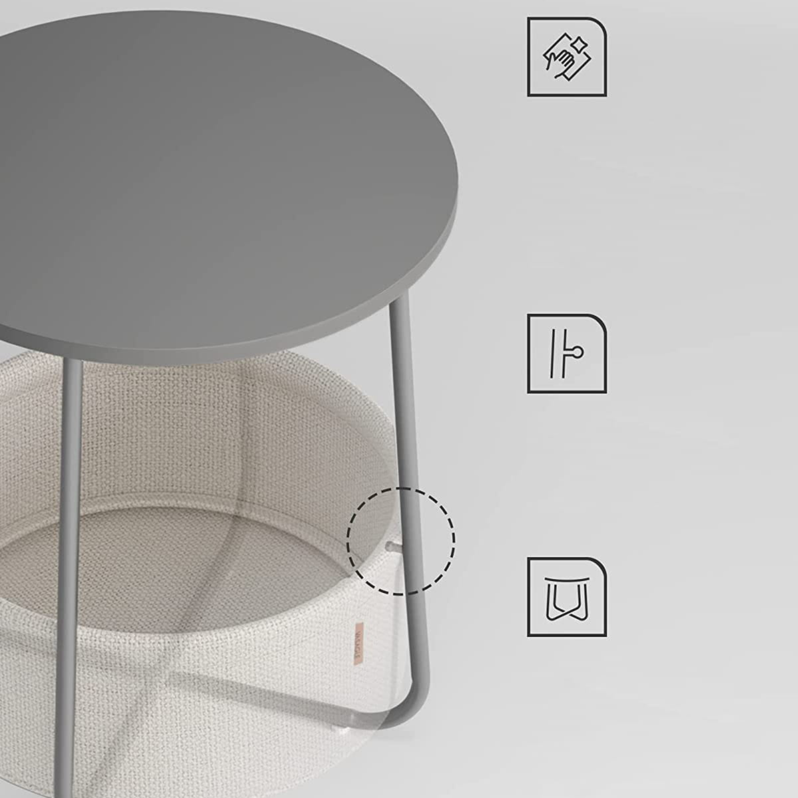 Stolik LUNGO wykonano z połączenia płyty wiórowej, stali oraz tkaniny poliestrowej, co zapewnia mu solidność i trwałość na lata. Cementowy blat w odcieniu szarości harmonijnie łączy się z jasnym, tekstylnym koszem, tworząc nowoczesne, a zarazem przytulne zestawienie. To mebel, który doskonale uzupełni zarówno minimalistyczne, jak i bardziej dekoracyjne wnętrza. Wysoka jakość wykonania i estetyczne wykończenie podkreślają jego ponadczasowy charakter.