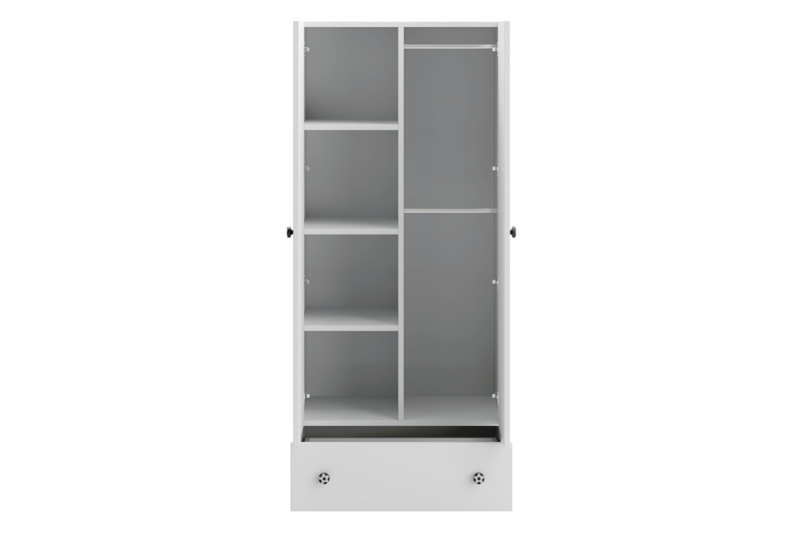 Szafa STELLA GOAL została wyposażona w praktyczny układ wewnętrzny – cztery półki oraz dwa drążki, które pozwalają wygodnie przechowywać zarówno złożone ubrania, jak i te na wieszakach. Dodatkowo, pojemna szuflada z prowadnicami kulkowymi i blokadą wysuwu to doskonałe miejsce na drobiazgi lub codzienne akcesoria. Zastosowanie zawiasów z cichym domykiem sprawia, że drzwi zamykają się płynnie i bez hałasu, co zwiększa komfort i bezpieczeństwo użytkowania, szczególnie w pokoju dziecka.