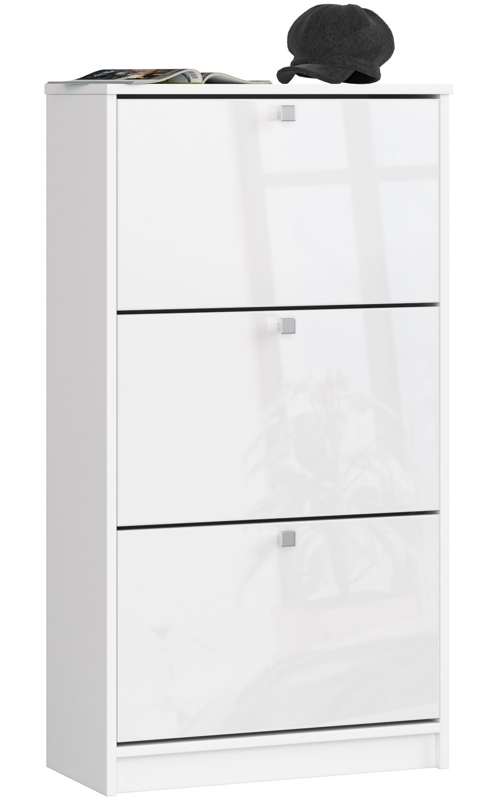 Prezentowana biała szafka na buty to połączenie nowoczesnego designu i przemyślanej funkcjonalności. Mebel został wyposażony w trzy uchylne szuflady z koszami dwurzędowymi wykonanymi z tworzywa sztucznego, które pomieszczą wiele par obuwia. Biały kolor oraz połyskujące fronty sprawiają, że szafka rozświetla przestrzeń i optycznie ją powiększa, co czyni ją idealnym wyborem do małych, niedoświetlonych korytarzy.