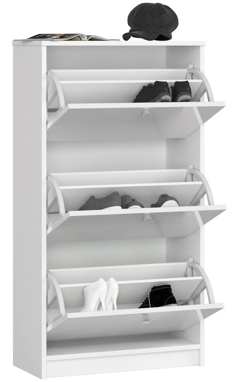 Szafka wyposażona jest w trzy głębokie kosze dwurzędowe, które pozwalają uporządkować różnorodne typy obuwia – od codziennych trampek, przez eleganckie szpilki, po zimowe botki. Uchylne drzwiczki umożliwiają łatwy dostęp do zawartości i zapewniają wygodę użytkowania nawet w codziennym pośpiechu.