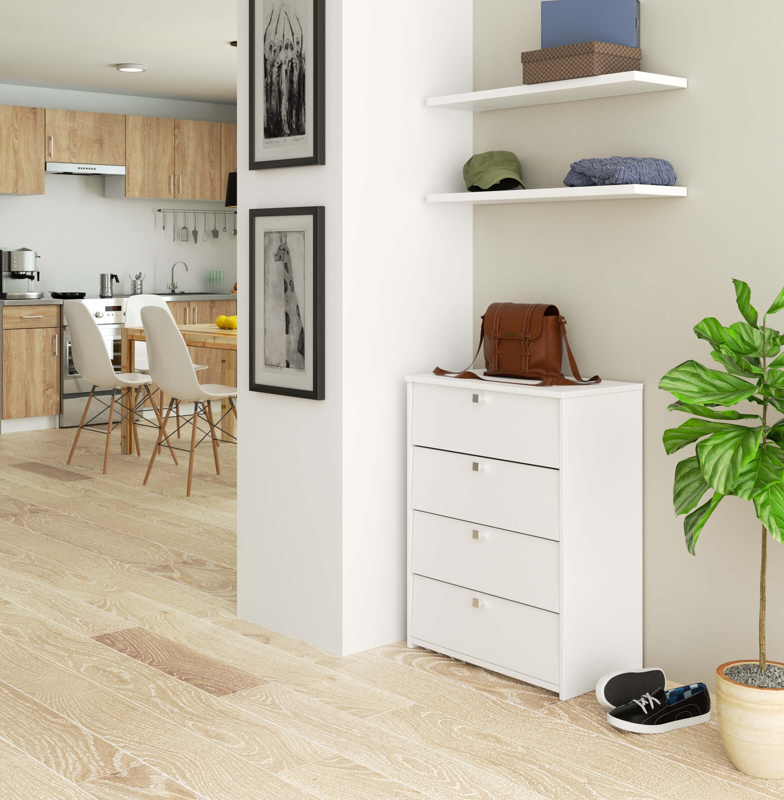 Biała szafka na buty z 4 uchylnymi szufladami – elegancja i porządek w stylu skandynawskim