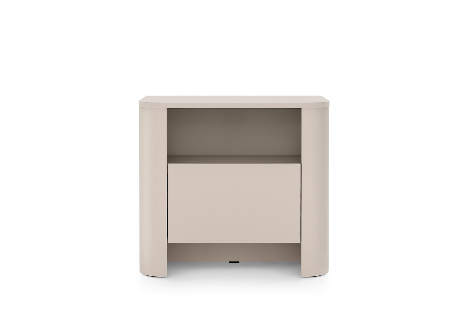 Szafka nocna BALI to połączenie minimalistycznej formy, naturalnych tonów i nowoczesnych rozwiązań użytkowych. Jej matowe wykończenie w odcieniu kaszmiru z delikatną strukturą drewna wprowadza do sypialni ciepło i spokój, a zaokrąglone krawędzie nadają jej miękkości i elegancji. Dzięki przemyślanej konstrukcji mebel doskonale komponuje się z pozostałymi elementami kolekcji BALI, tworząc harmonijną przestrzeń sprzyjającą relaksowi.