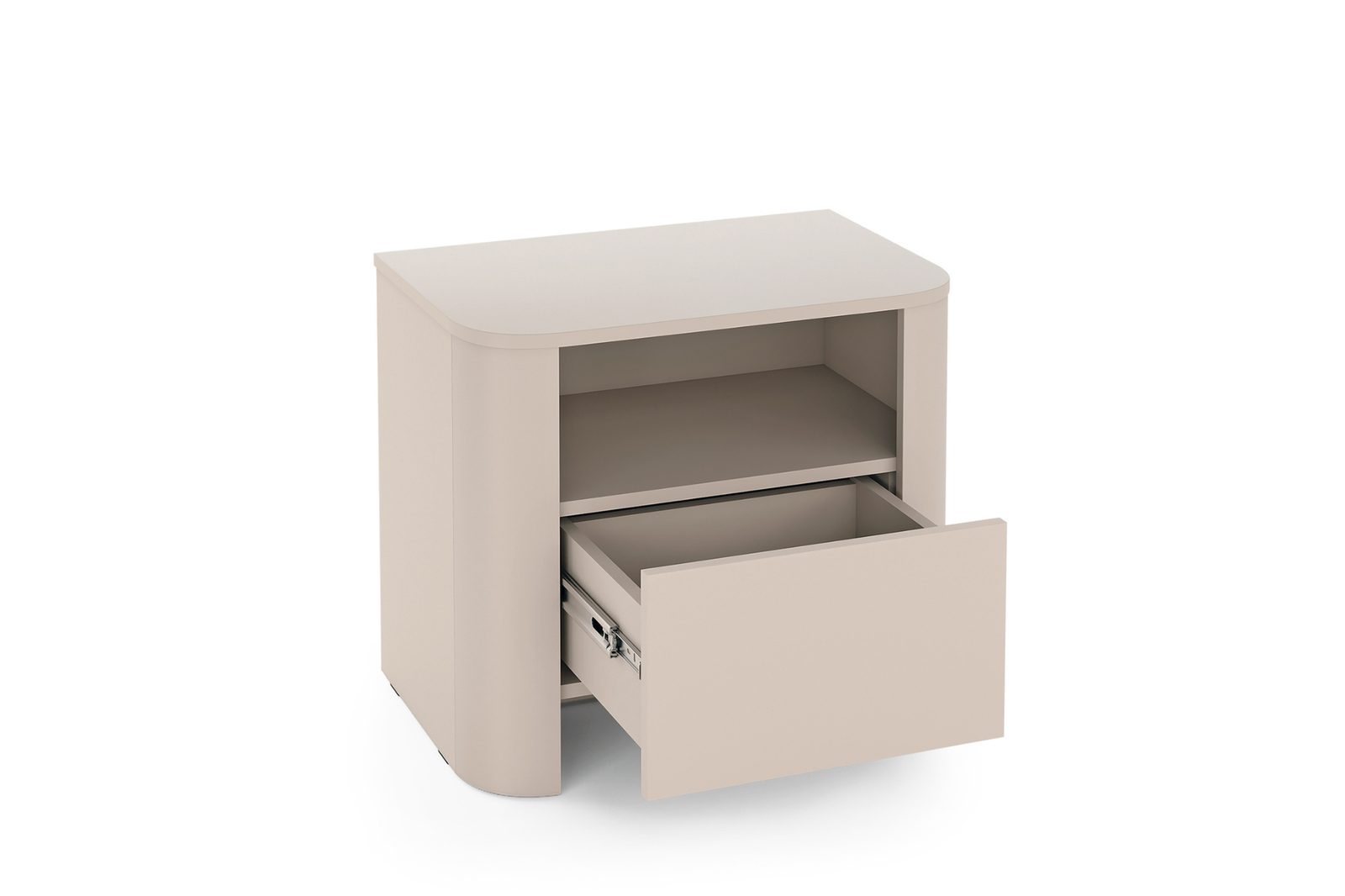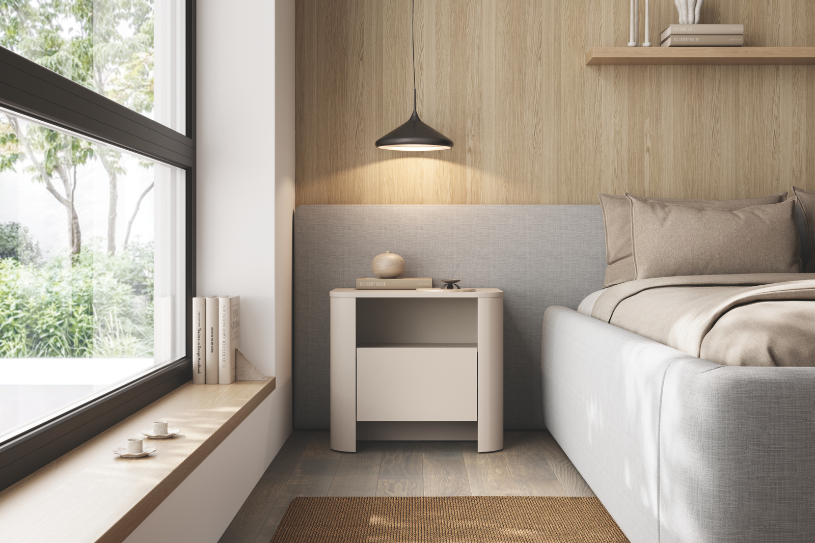 Szafka nocna BALI została zaprojektowana tak, by zapewnić maksymalny komfort użytkowania. Wyposażona w pojemną szufladę z systemem „push-to-open” oraz ciche prowadnice z funkcją domyku, pozwala na łatwy i bezgłośny dostęp do przechowywanych przedmiotów. Otwarta półka umieszczona nad szufladą to idealne miejsce na lampkę nocną, książkę lub drobne dekoracje.