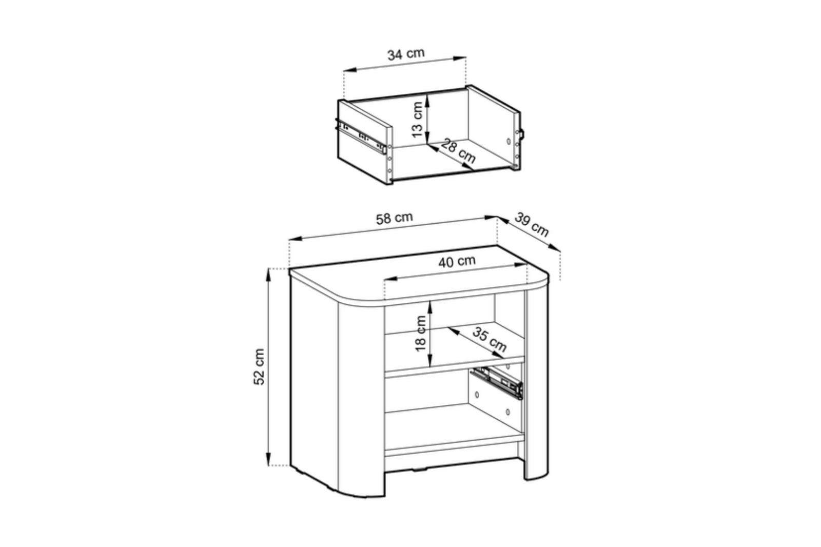 • Półka: otwarta – idealna na książki, lampkę lub dekoracje