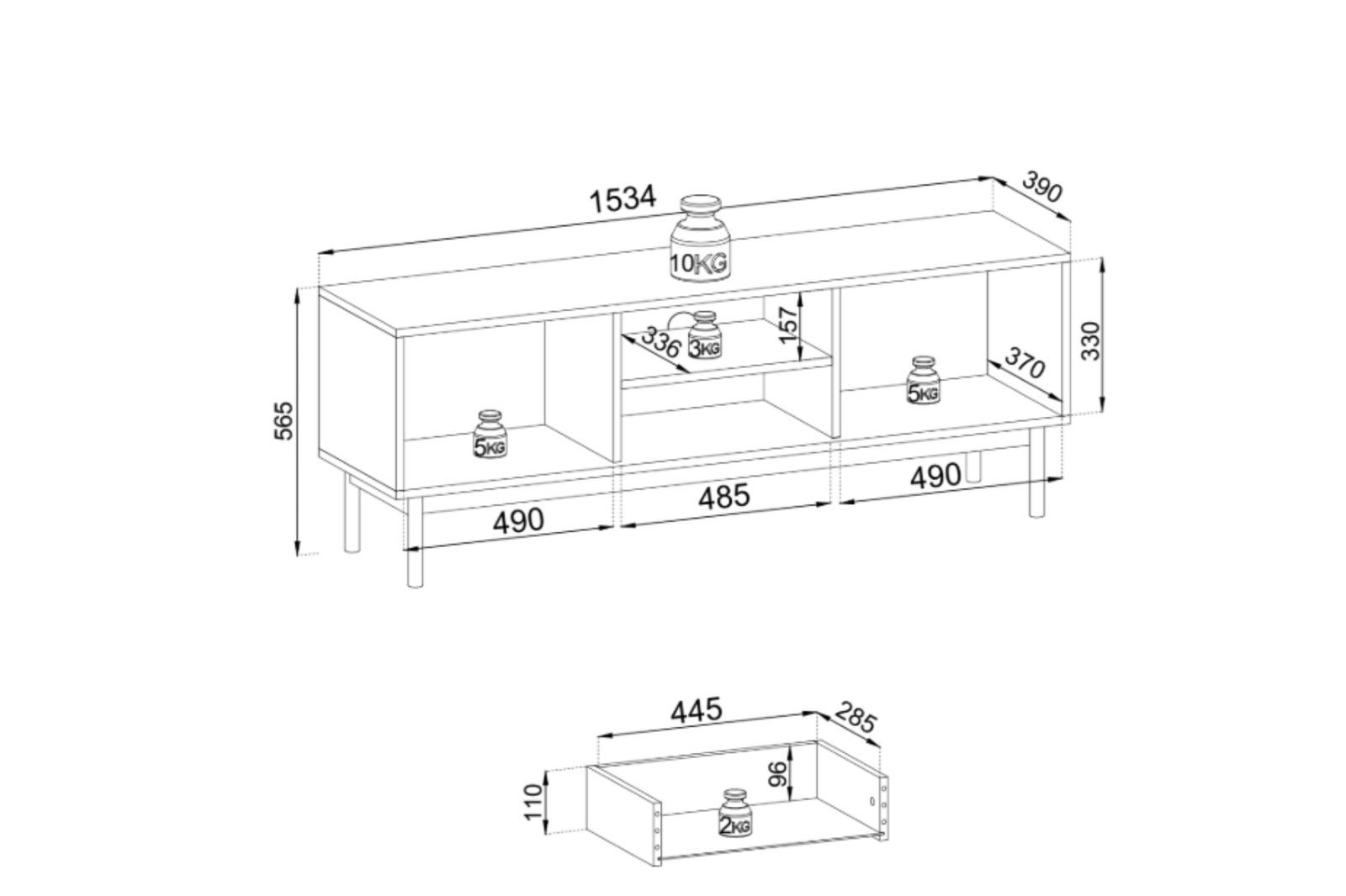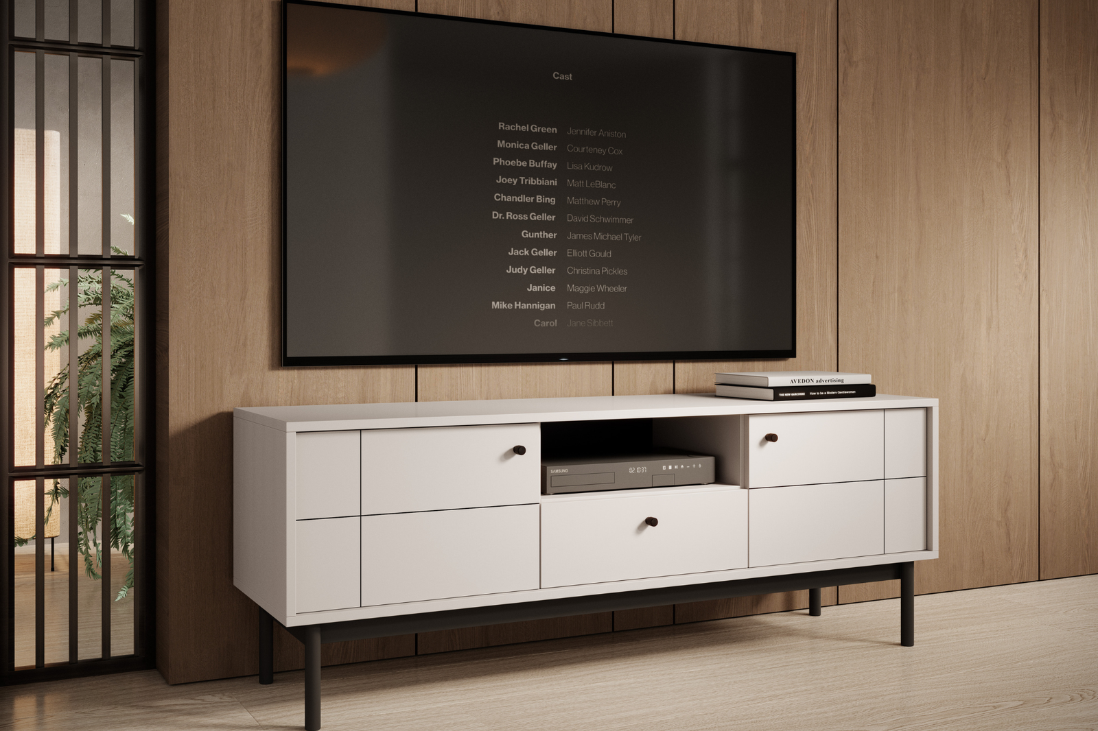 Szafka RTV SILEN zapewnia nie tylko piękny wygląd, ale i wygodę w codziennym użytkowaniu. Wyposażona jest w dwie pojemne szafki z drzwiczkami oraz praktyczną szufladę z prowadnicami dolnego montażu i funkcją dociągu. Zawiasy z cichym domykiem gwarantują płynne, bezgłośne zamykanie. Czarne, metalowe uchwyty w formie eleganckich gałek dopełniają całości i zapobiegają pozostawianiu śladów na powierzchni frontów. Drewniane nogi malowane na czarno nadają meblowi lekkości, a jednocześnie zapewniają stabilność i wygodę sprzątania pod meblem – również przy użyciu robota sprzątającego.