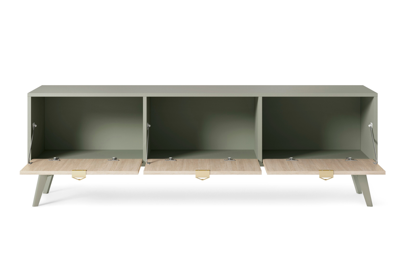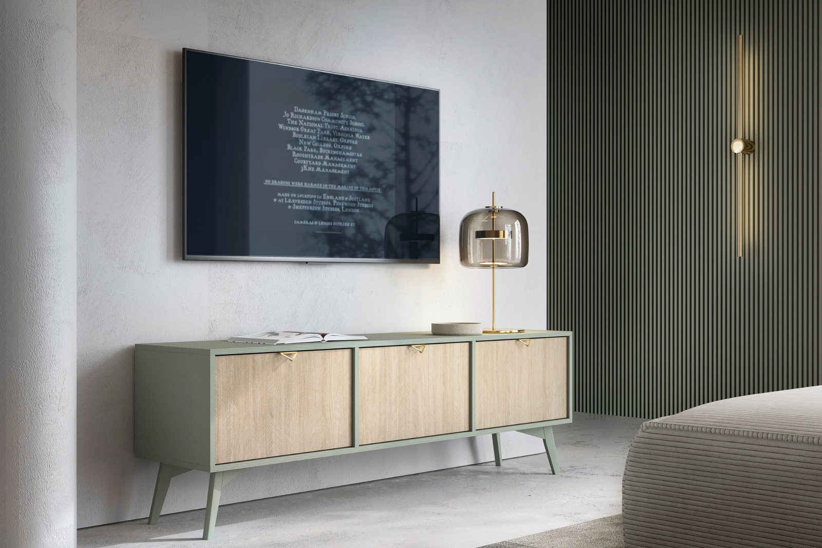 Szafka RTV VINORA to stylowy mebel inspirowany naturą, łączący zieleń eukaliptusa z dekoracyjnym wzorem jodełki scandi. Przestronne schowki i wygodne klapy ułatwiają przechowywanie sprzętu oraz akcesoriów, a matowe wykończenie i eleganckie złote detale nadają szafce wyjątkowego, nowoczesnego charakteru.
