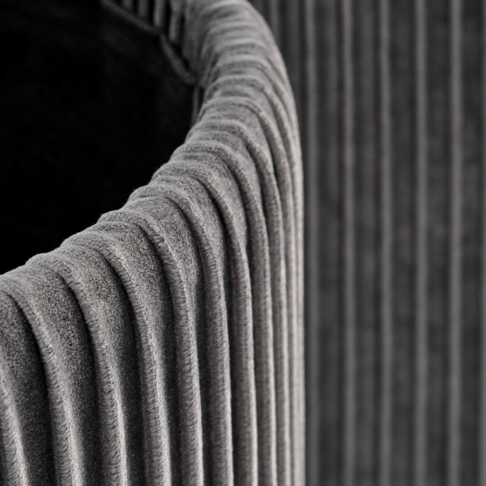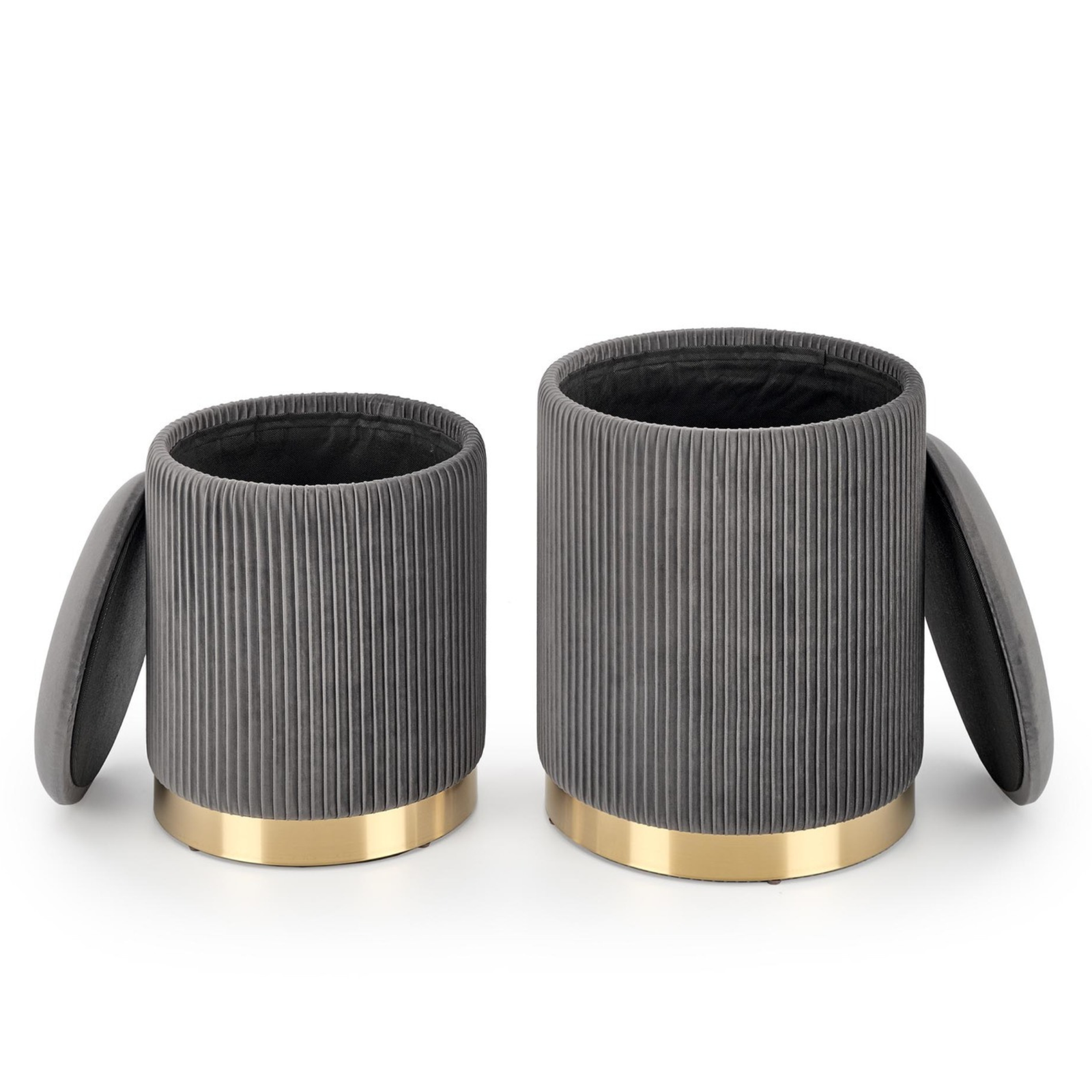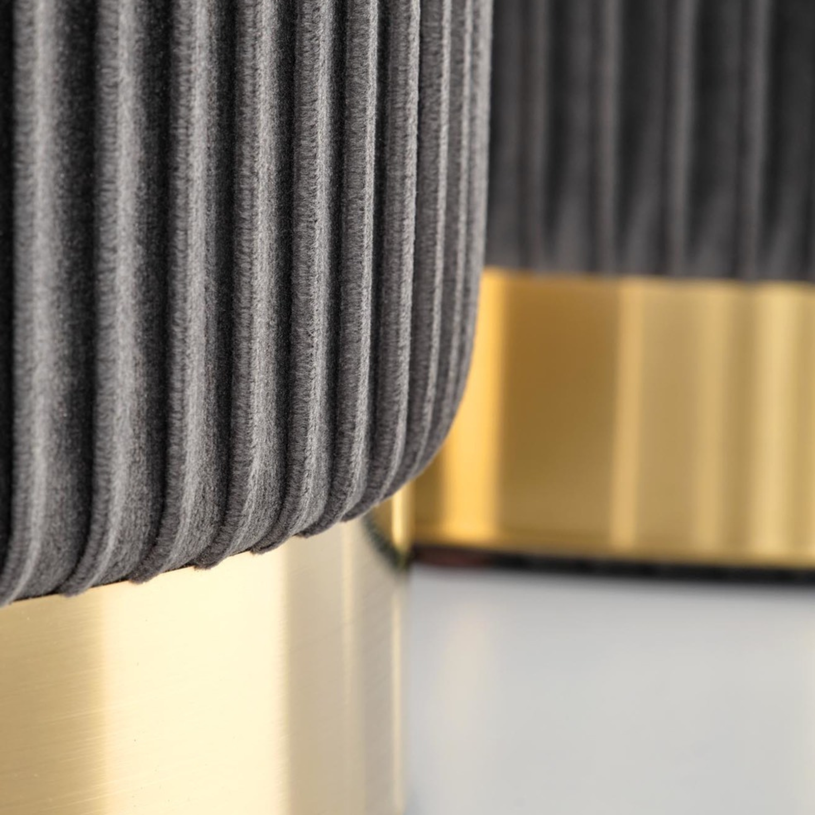 Pufy MARINE to stylowy zestaw dwóch tapicerowanych puf, zaprojektowany z myślą o wnętrzach pełnych klasy i elegancji. Aksamitna tkanina velvet w głębokim, popielatym odcieniu pięknie odbija światło, podkreślając luksusowy charakter mebla. Złota, chromowana podstawa dodaje całości nowoczesnego akcentu i sprawia, że pufy doskonale odnajdą się w aranżacjach glamour.