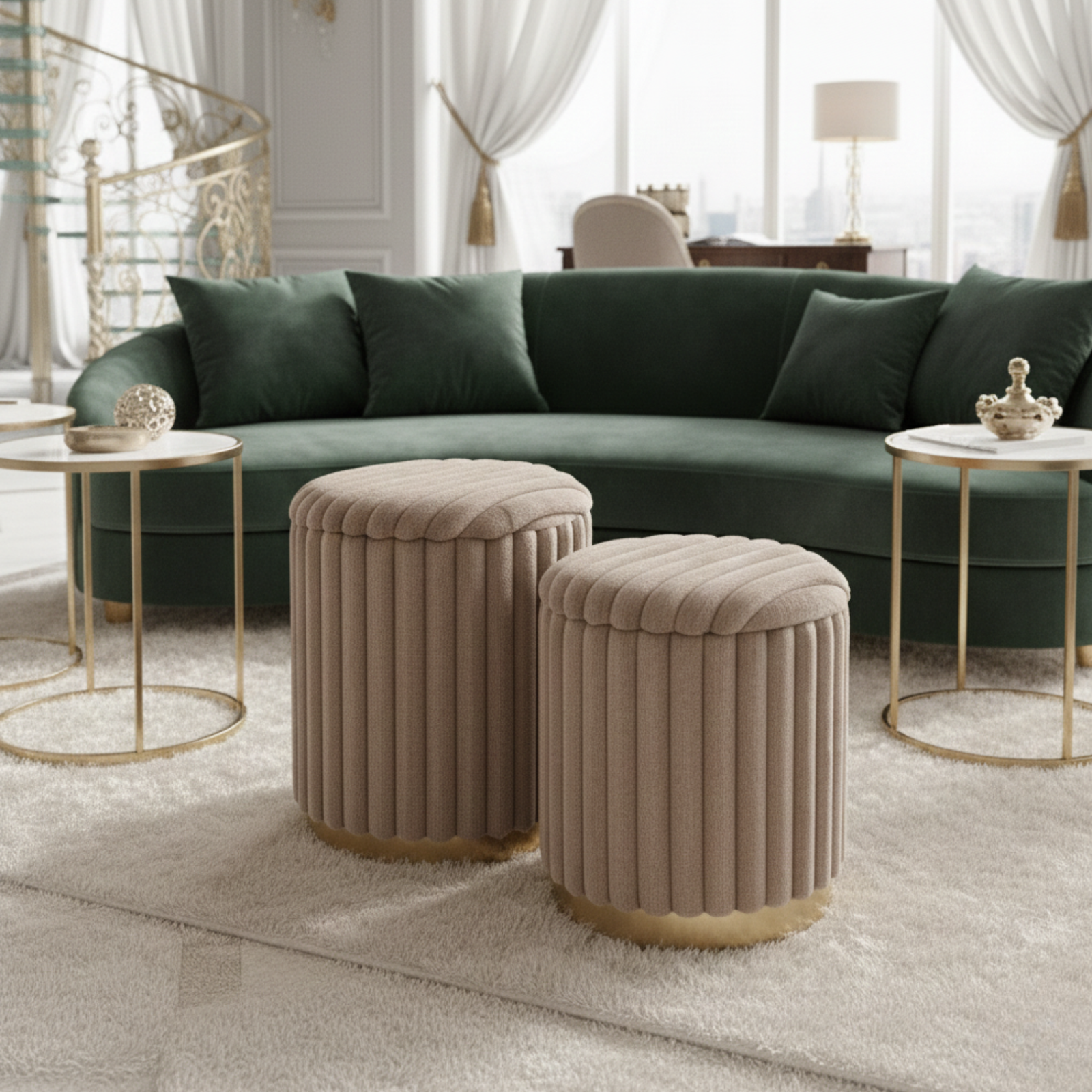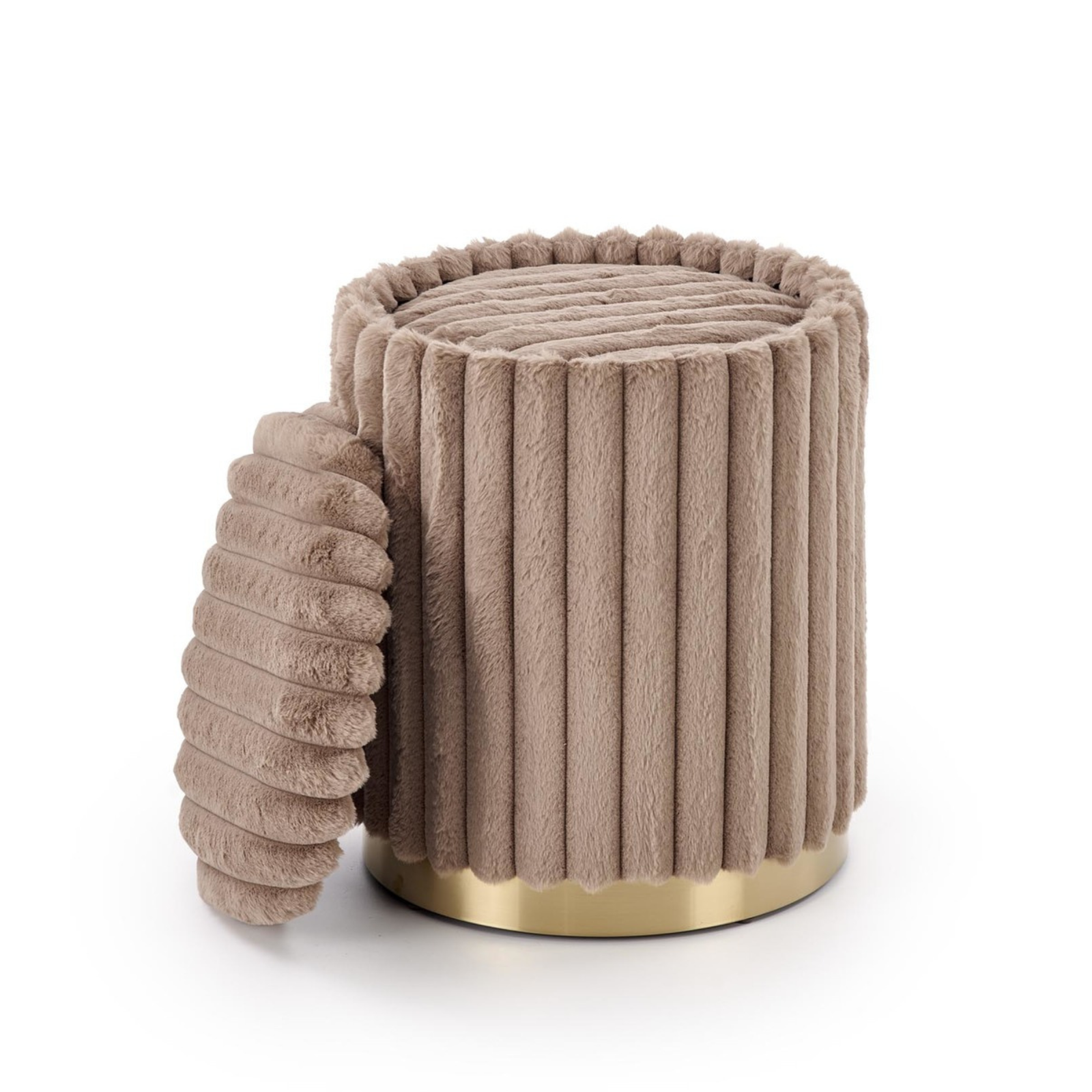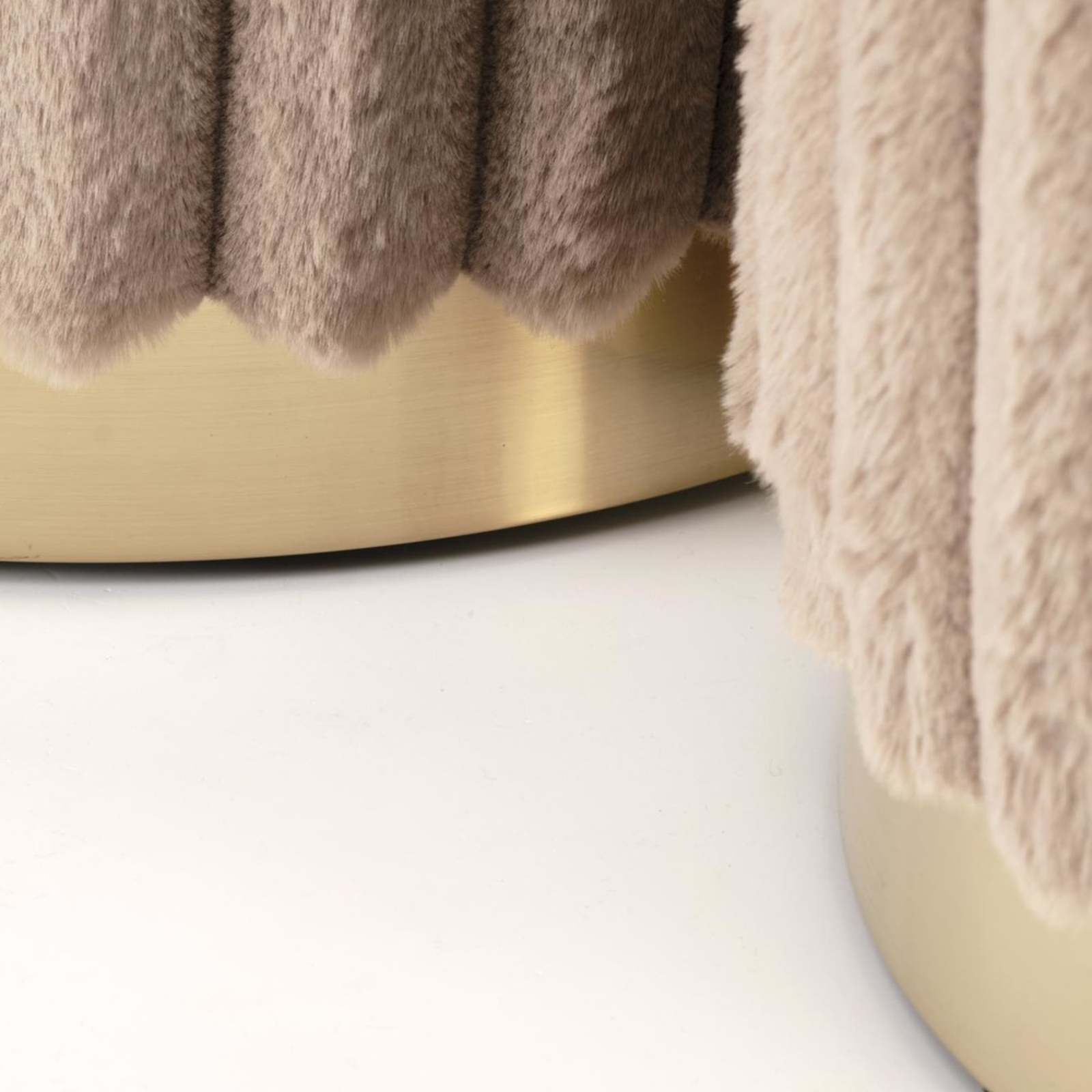 Pufy MIRELLA to elegancki zestaw dwóch tapicerowanych puf, który łączy nowoczesny styl z nutą glamour. Miękka, włochata tkanina w kolorze cappuccino nadaje im wyjątkowej przytulności, a metalowa podstawa w złotym odcieniu podkreśla luksusowy charakter mebla. To praktyczne i dekoracyjne rozwiązanie do wielu wnętrz.