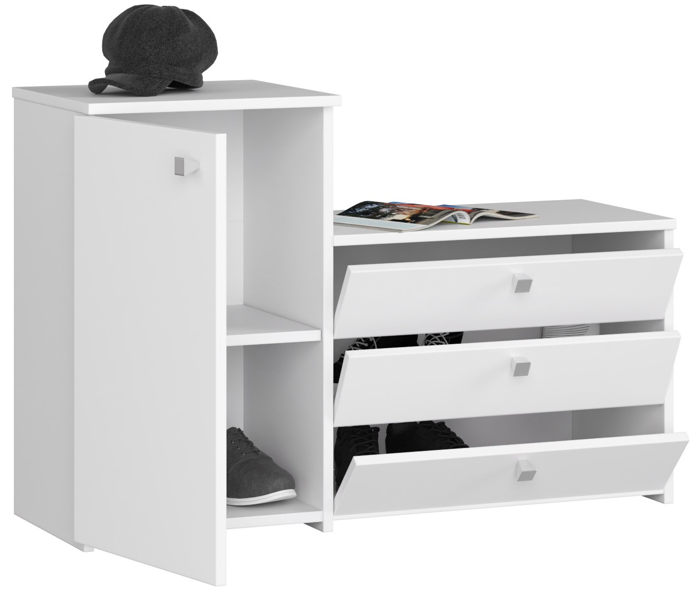 Prezentowany biały zestaw mebli do przedpokoju to idealne połączenie nowoczesnego wyglądu z praktycznym zastosowaniem. W jego skład wchodzi szafka z trzema szerokimi szufladami o uchylnych frontach oraz pojemna komoda z dwiema przestronnymi półkami. Dzięki przemyślanej konstrukcji meble te pomieszczą nie tylko obuwie, ale także akcesoria do jego pielęgnacji, torebki czy inne drobne przedmioty codziennego użytku.
