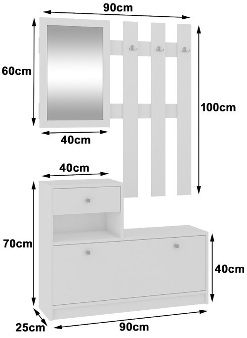 W skład zestawu wchodzi pojemna szafka na buty z dodatkowymi udogodnieniami: małą szufladą na drobiazgi, takimi jak klucze, oraz wnęką nad szufladą, idealną na podręczne przedmioty. Całość uzupełnia praktyczny wieszak z kilkoma haczykami oraz duże lustro, dzięki któremu tuż przed wyjściem możesz szybko sprawdzić swój wygląd. To przemyślany komplet, który łączy codzienną wygodę z estetyką.