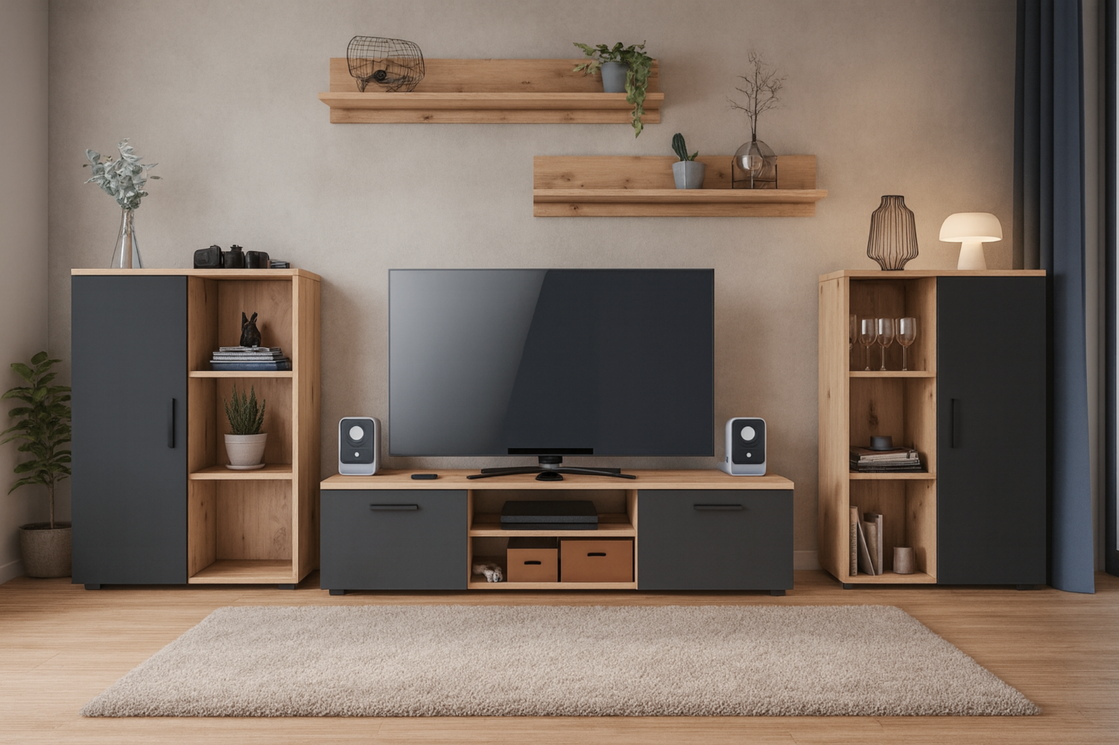 Zestaw został wykonany z trwałych i odpornych na codzienne użytkowanie materiałów. Szafka RTV, dwie komody oraz dwie półki ścienne powstały z solidnej płyty laminowanej o grubości 18 mm, która cechuje się odpornością na zarysowania i łatwością w czyszczeniu. Tylną ściankę w szafce RTV oraz komodach wykonano z wytrzymałej płyty HDF, co zwiększa stabilność konstrukcji. Wszystkie krawędzie zostały starannie oklejone obrzeżem PCV, co dodatkowo zwiększa ich trwałość i poprawia estetykę mebla. To połączenie estetyki, trwałości i wygody użytkowania.