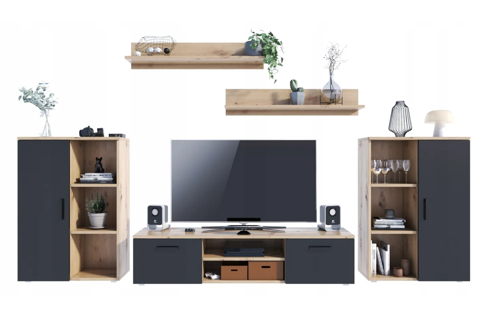 Dwie półki ścienne wiszące doskonale uzupełniają zestaw. Minimalistyczne, nowoczesne półki ścienne umożliwią efektowną ekspozycję zdjęć, książek, roślin czy dodatków. Ich minimalistyczna forma podkreśla styl całej meblościanki.