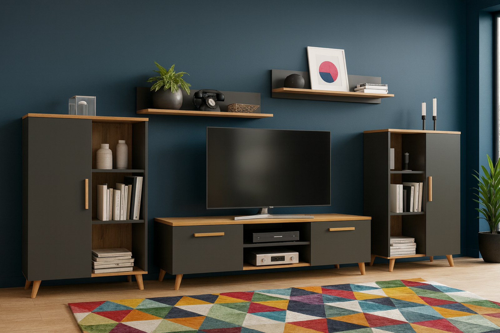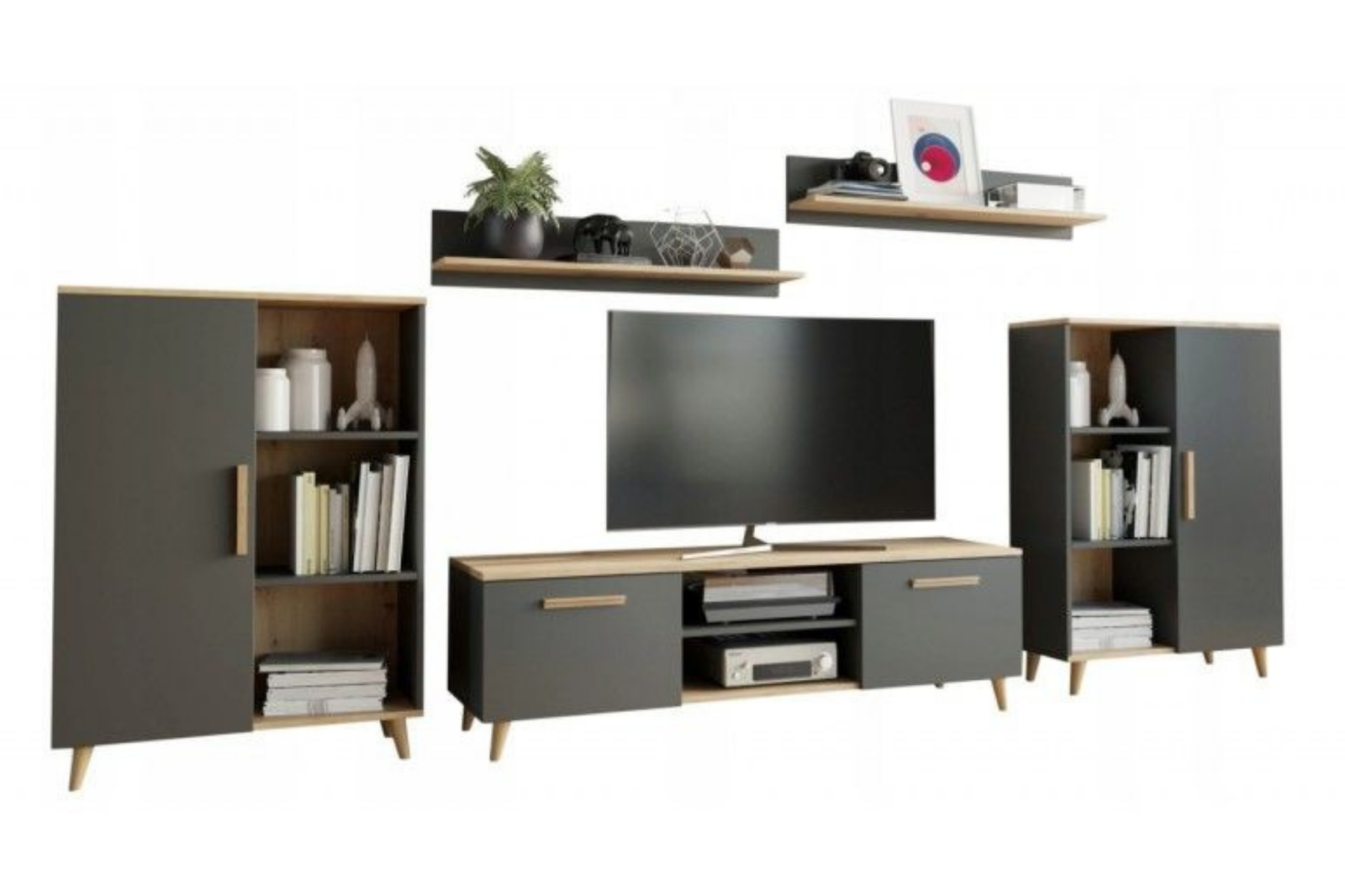Zestaw mebli do salonu OSKAR II szafka RTV, komody, półki, styl skandynawski, nogi drewniane - Antracyt / Dąb Artisan