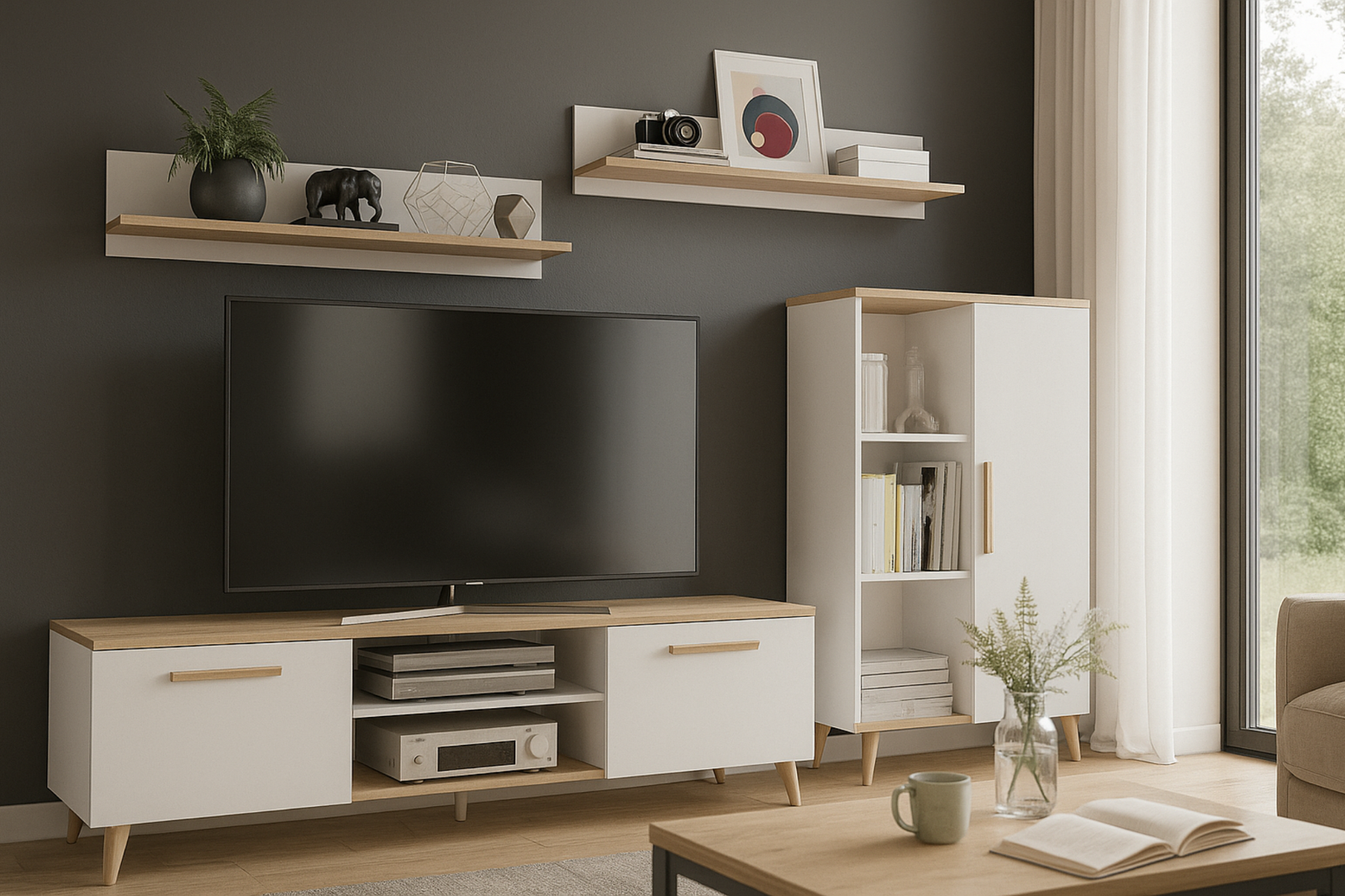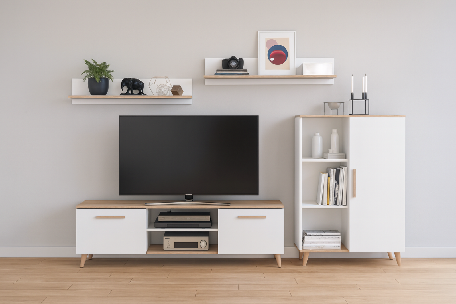 Zestaw został wykonany z trwałych i odpornych na codzienne użytkowanie materiałów. Komoda, szafka RTV oraz dwie półki ścienne powstały z solidnej płyty laminowanej o grubości 18 mm, która cechuje się odpornością na zarysowania i łatwością w czyszczeniu. Tylną ściankę komody oraz szafki RTV wykonano z wytrzymałej płyty HDF, co zwiększa stabilność konstrukcji. Wszystkie krawędzie zostały starannie oklejone obrzeżem PCV, co dodatkowo zwiększa ich trwałość i poprawia estetykę mebla. Drewniane bukowe nóżki oraz uchwyty nadają całości eleganckiego i naturalnego charakteru, podkreślając skandynawski styl zestawu. To połączenie estetyki, trwałości i wygody użytkowania.