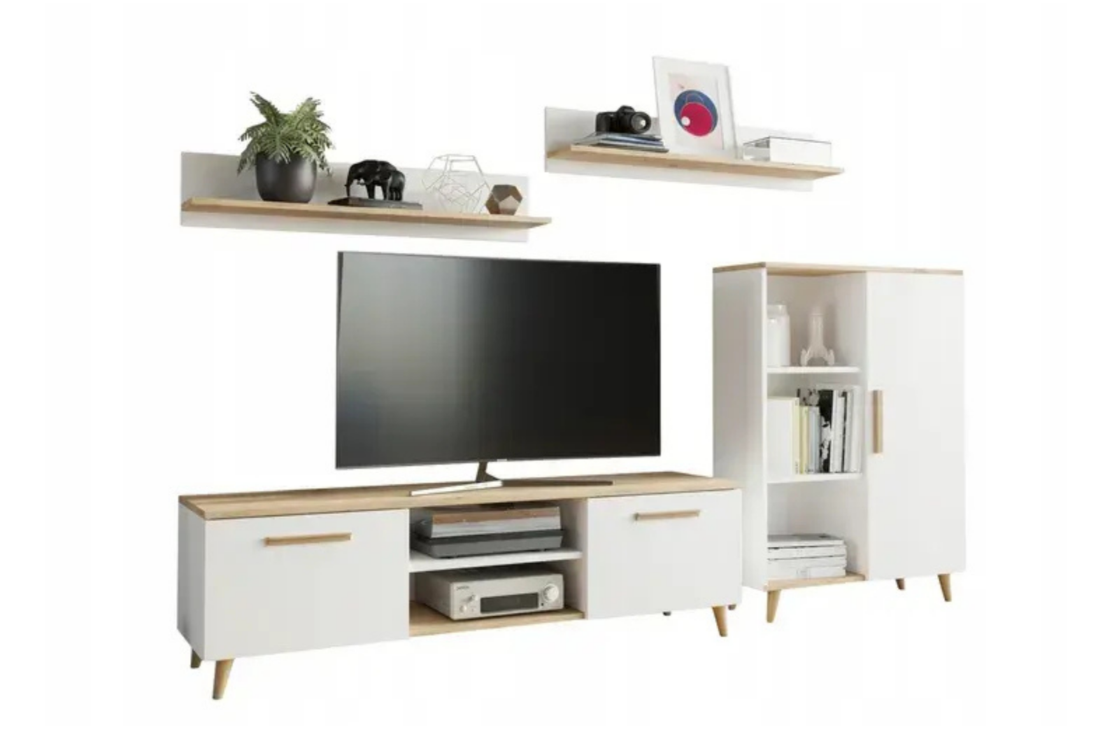 Zestaw mebli do salonu OSKAR komoda, szafka RTV, półki, styl skandynawski, nogi drewniane - Biały / Dąb Artisan