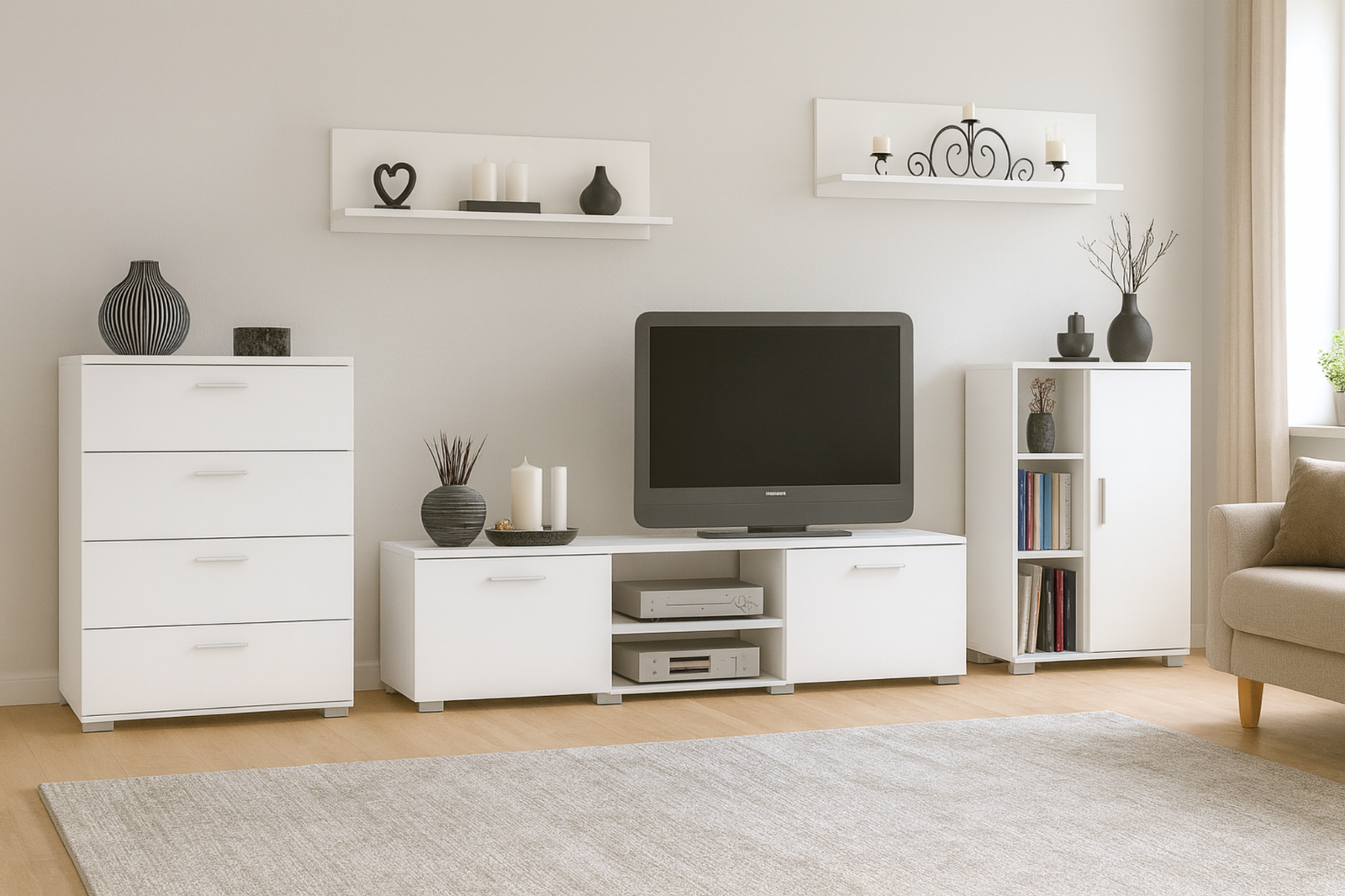Zestaw został wykonany z trwałych i odpornych na codzienne użytkowanie materiałów. Szafka RTV, dwie komody oraz dwie półki ścienne powstały z solidnej płyty laminowanej o grubości 18 mm, która cechuje się odpornością na zarysowania i łatwością w czyszczeniu. Tylną ściankę w szafce RTV oraz komodach wykonano z wytrzymałej płyty HDF, co zwiększa stabilność konstrukcji. Wszystkie krawędzie zostały starannie oklejone obrzeżem PCV, co dodatkowo zwiększa ich trwałość i poprawia estetykę mebla. To połączenie estetyki, trwałości i wygody użytkowania.