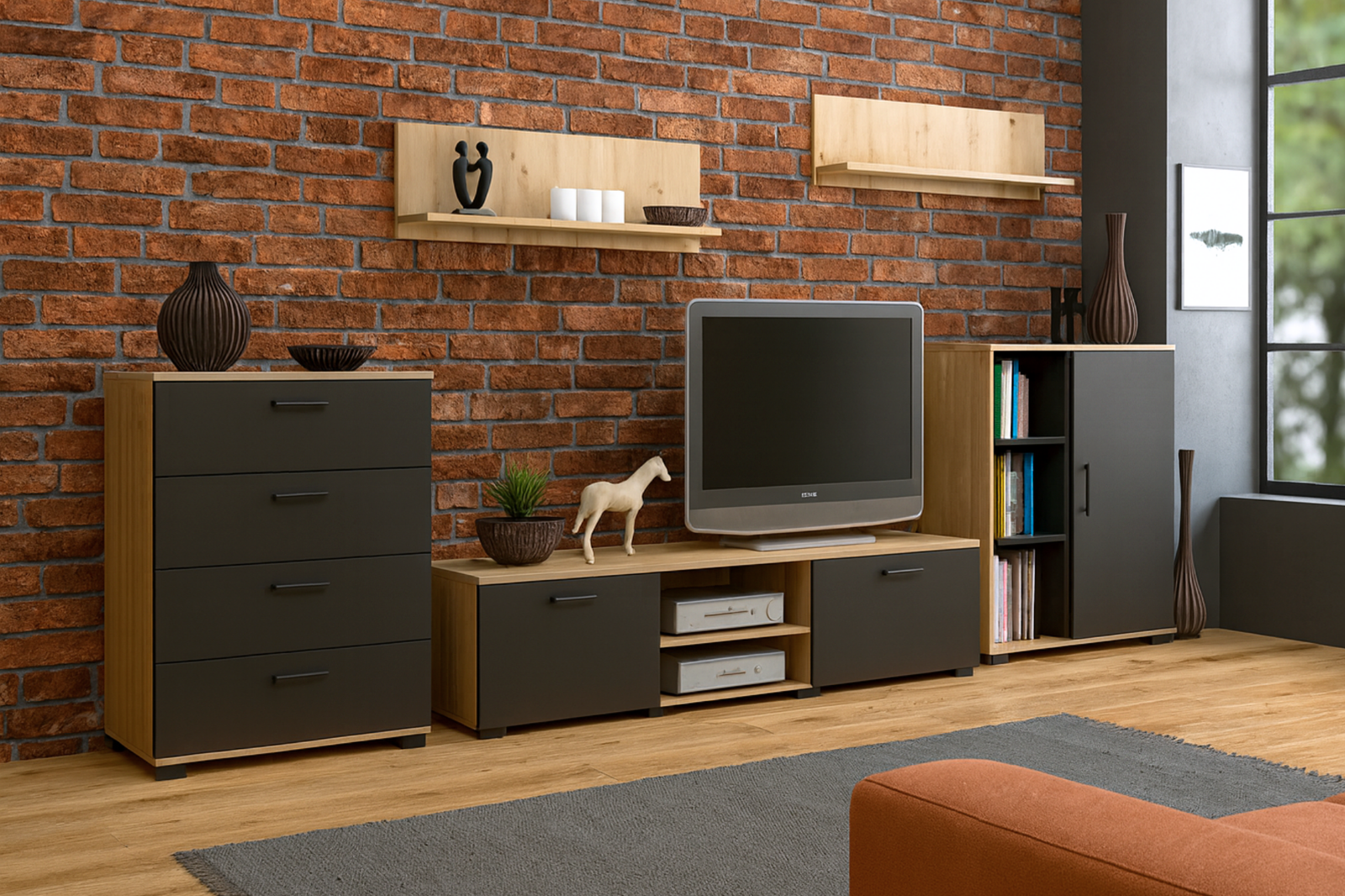 Zestaw został wykonany z trwałych i odpornych na codzienne użytkowanie materiałów. Szafka RTV, dwie komody oraz dwie półki ścienne powstały z solidnej płyty laminowanej o grubości 18 mm, która cechuje się odpornością na zarysowania i łatwością w czyszczeniu. Tylną ściankę w szafce RTV oraz komodach wykonano z wytrzymałej płyty HDF, co zwiększa stabilność konstrukcji. Wszystkie krawędzie zostały starannie oklejone obrzeżem PCV, co dodatkowo zwiększa ich trwałość i poprawia estetykę mebla. To połączenie estetyki, trwałości i wygody użytkowania.
