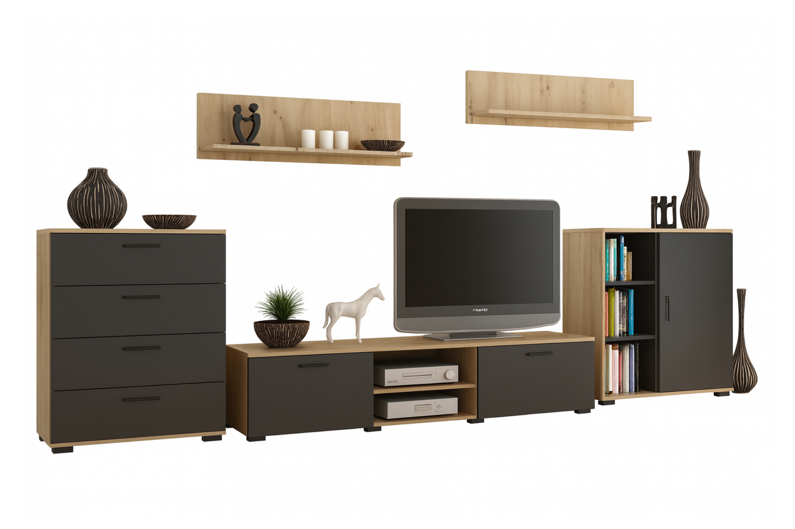 Zestaw mebli do salonu SOFEN II szafka RTV, komoda, szafka, półki - Dąb Artisan / Czarny